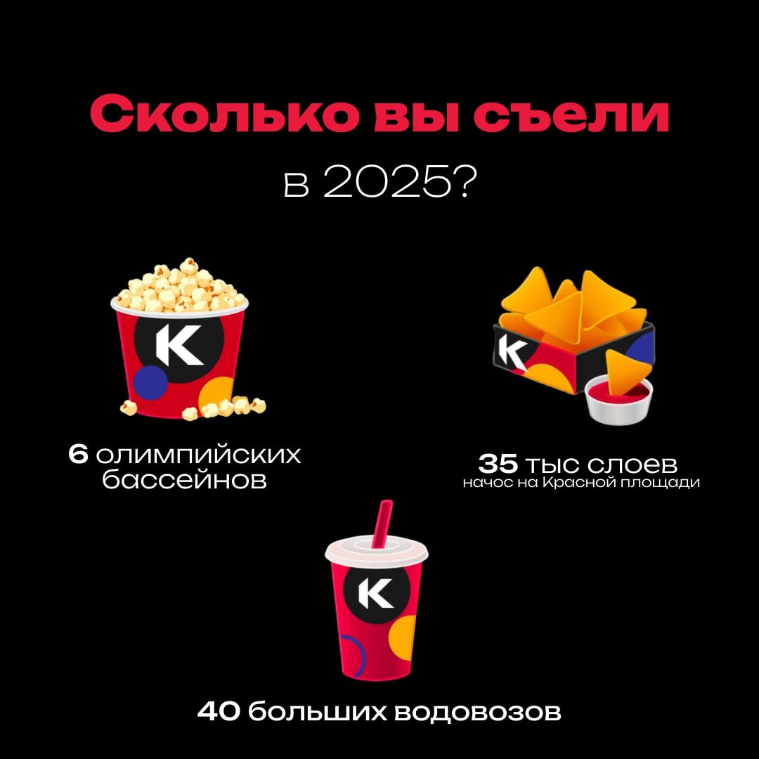 решил наш менеджер по кинобарам и собрал для вас статистику нашего магазина на диване за 2025 год: 🍿 Если сложить весь съеденный за 2025 год попкорн, он еле поместится на танкере или сухогрузе. Это примерно 6 олимпийских бассейнов. Мы бы в такой бассейн занырнули бы, а вы? Единственное, что смущает - самым популярным был карамельный попкорн, липковато было бы плавать, но как-то бы справились 🔶 Начос схрустели столько, что ими можно было покрыть Красную площадь на 35 тысяч слоев!!!! 🌭А хот-догами можно было бы выложить всю надводную часть Крымского моста. За качество строительного материала не отвечаем, а вот супер-вкус гарантируем 🤤 🥤Ну не в сухомятку же есть? Конечно, да. За этот год в кинотеатры привезли около 40 больших фур-водовозов, чтобы обеспечить всех напитками. Если мерить уже привычными бассейнами – заполним спортивный бассейн до бортиков! А бассейн - это что? Правильно, спорт. Спорт - это что? Правильно, польза для здоровья. Продолжаем наслаждаться и ни в чем себе н
