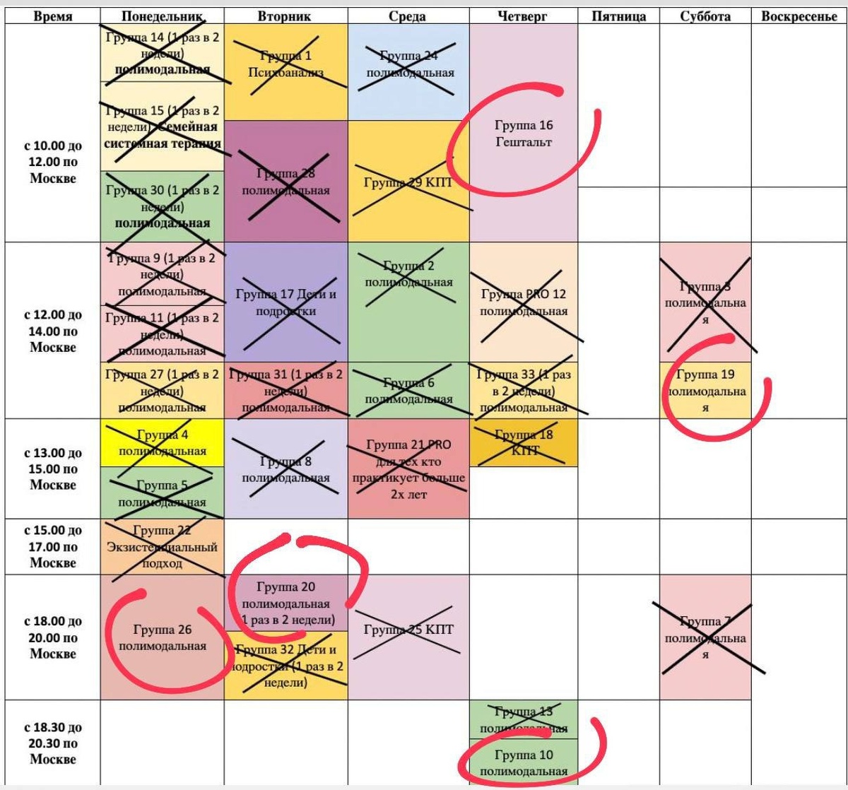 Сегодня (23 января) запись будет закрыта ✨ 1. Группа 10 вечерняя - 2 места 2. Группа 16 Гештальт - 2 места 2. Группа 26 вечерняя - 1 место 2. Группа 20 1 раз в 2 недели - Закончилось 3. Группа 19 субботняя - Закончилось ЗАПИСЬ ЗАКРЫТА 😥