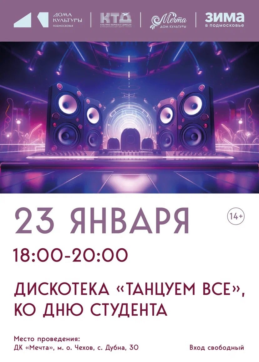 ✨ Дискотека в селе Дубна Дискотека «Танцуем все», посвященная Дню студента! 🎉🧑🎓✨ ✅ Вход свободный, так что приходи и наслаждайся отличной атмосферой, хорошей музыкой и весёлым настроением! 🚫 Возраст: 6+ 📆 23.01.2026 🕛 18:00 🏢 ДК «Мечта» 📍 г.о. Чехов, с. Дубна, д.30 🪙 Вход свободный❗️ ⭐Поддержать канал голосом ✅ Мероприятия Чехов https://dzen.ru/id/66cc4b48e9ef144699238a51 http://vk.com/chekhov_events http://dzen.ru/chekhov_events