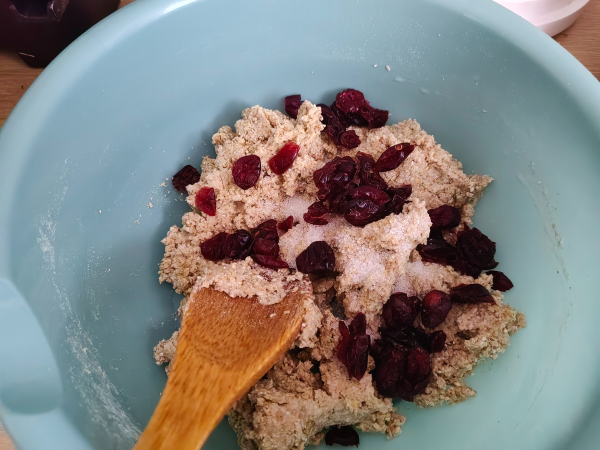 В овсяную муку добавляем кокосовое масло, сахар, разрыхлитель и овсяное молоко (для начала несколько столовых ложек). Все ингредиенты хорошо перемешиваем, затем всыпаем горсть клюквы и замешиваем тесто.