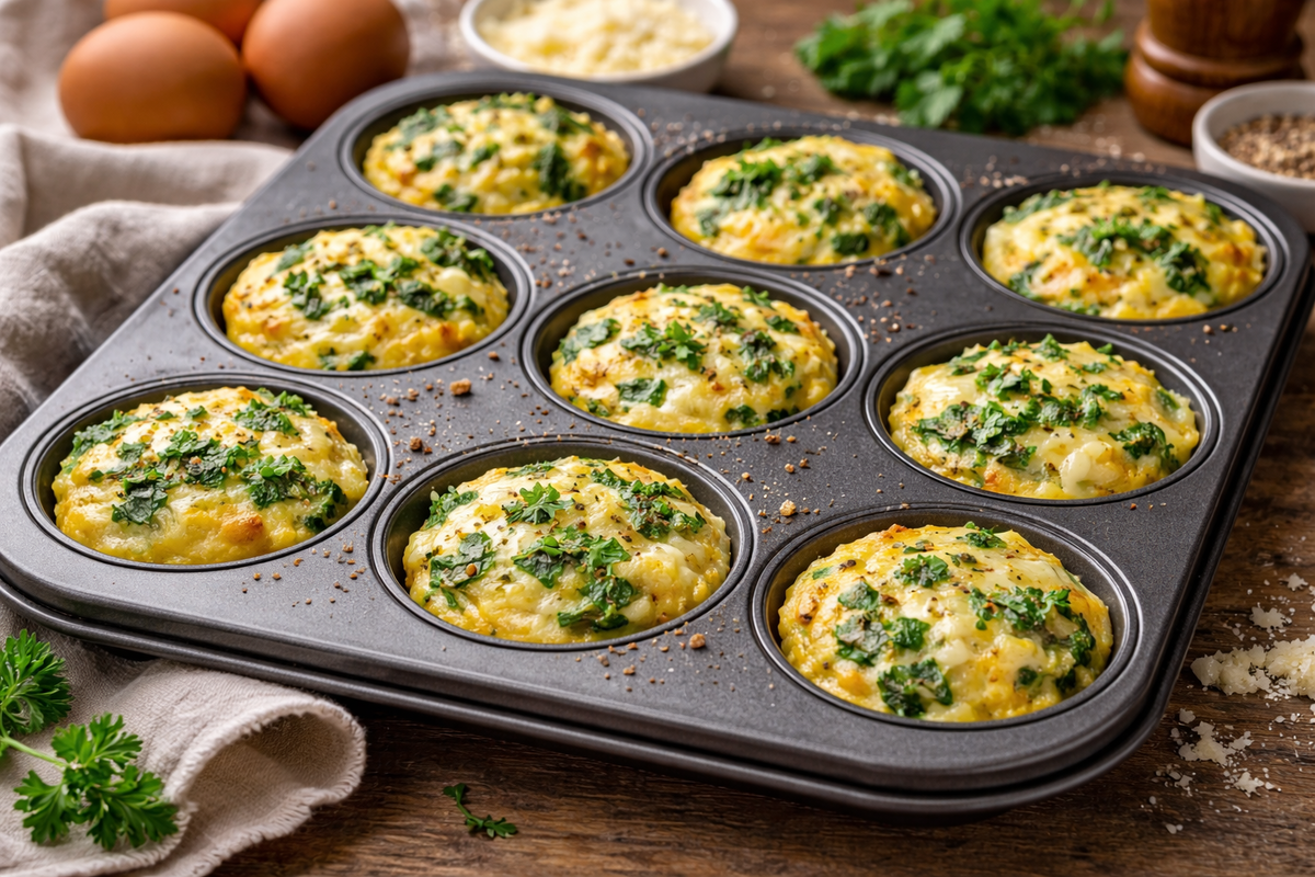 Если используете зелень или овощи — добавьте их сюда же. Разлейте смесь по формам для маффинов