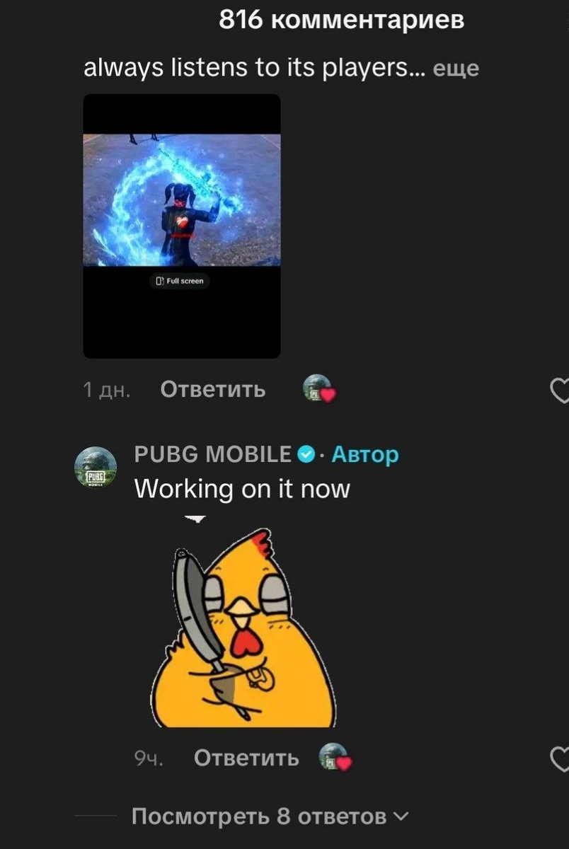 ? В соцсетях официальные аккаунты начали отвечать на просьбы игроков улучшить скин «Ледник» на M416. Разработчики обещают добавить эффект при взятии оружия в руки, как это уже реализовано у других улучшенных пушек. Те, у кого скин уже прокачан, получат этот эффект бесплатно, без дополнительных затрат. Наш бот для пополнения UC: @OneTwoPay_bot 😎 PUBG Mobile