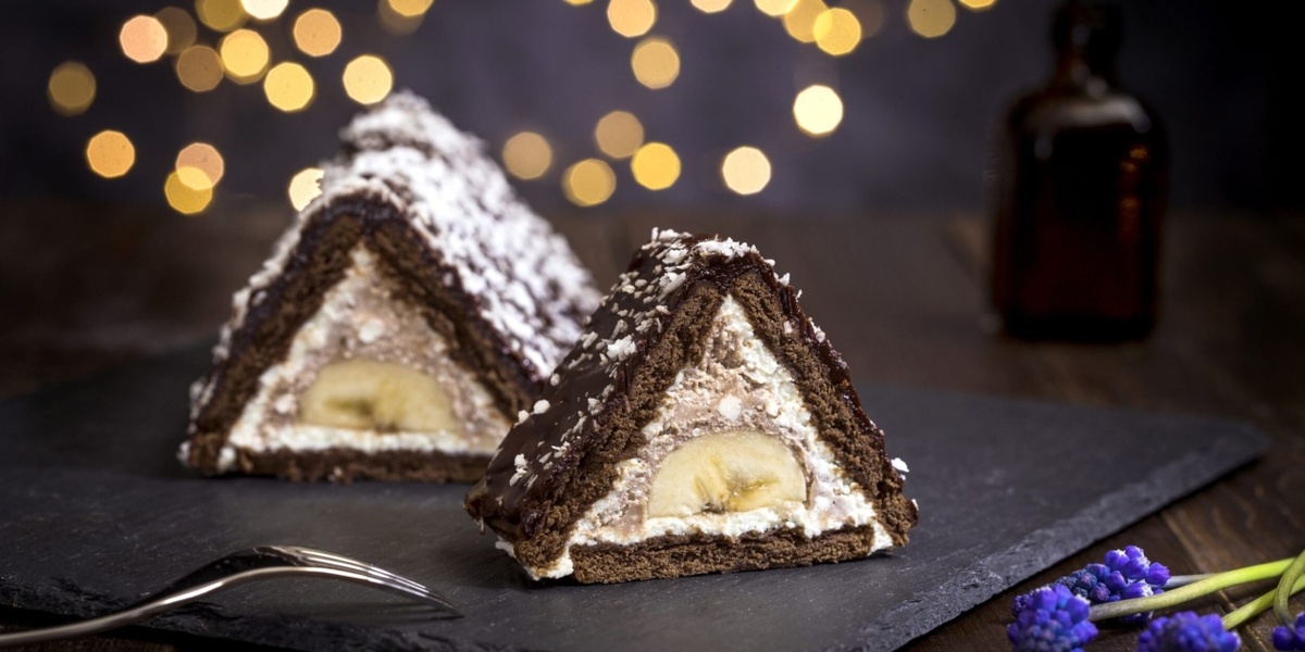 Во вторую половину крема вмешиваем какао и полностью покрываем бананы. 7️⃣ Формируем «домик»