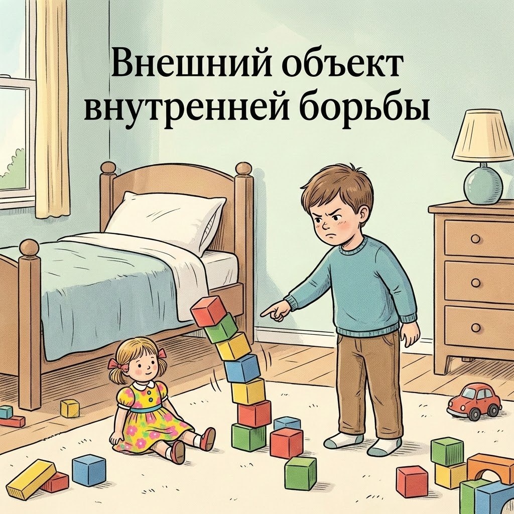 » 🧸 В кабинете мальчик строит башню и тут же её разрушает. «Это кукла сломала!» — говорит он. Ребёнок переносит на игрушку свои агрессивные импульсы, не признавая их как свои. Это не просто игра — это проективное внедрение. Он бессознательно разделяет свой внутренний мир, чтобы справиться с тревогой. 👧 Девочка, играя с куклой, вдруг кричит: «Она плохая, надо её наказать!» Здесь проекция идёт дальше: ребёнок не только отделяет агрессивные части, но и идентифицируется с ними, используя куклу как внешний объект для внутренней борьбы. 🧸 Такие сцены не редкость. Они показывают, как проективное внедрение помогает ребёнку временно освободиться от тревоги, «вынеся» её за пределы своего Я. Но цена этой защиты — ослабление Эго и формирование враждебных внутренних объектов. @Элеонора Красилова ··· ··· Запись на консультацию: @eleonora_krasilova