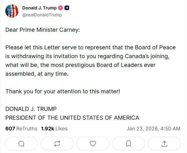 🗞️Дональд Трамп в Truth Social заявил, что Совет мира отзывает приглашение премьер-министру Канады Марку Карни войти в организацию