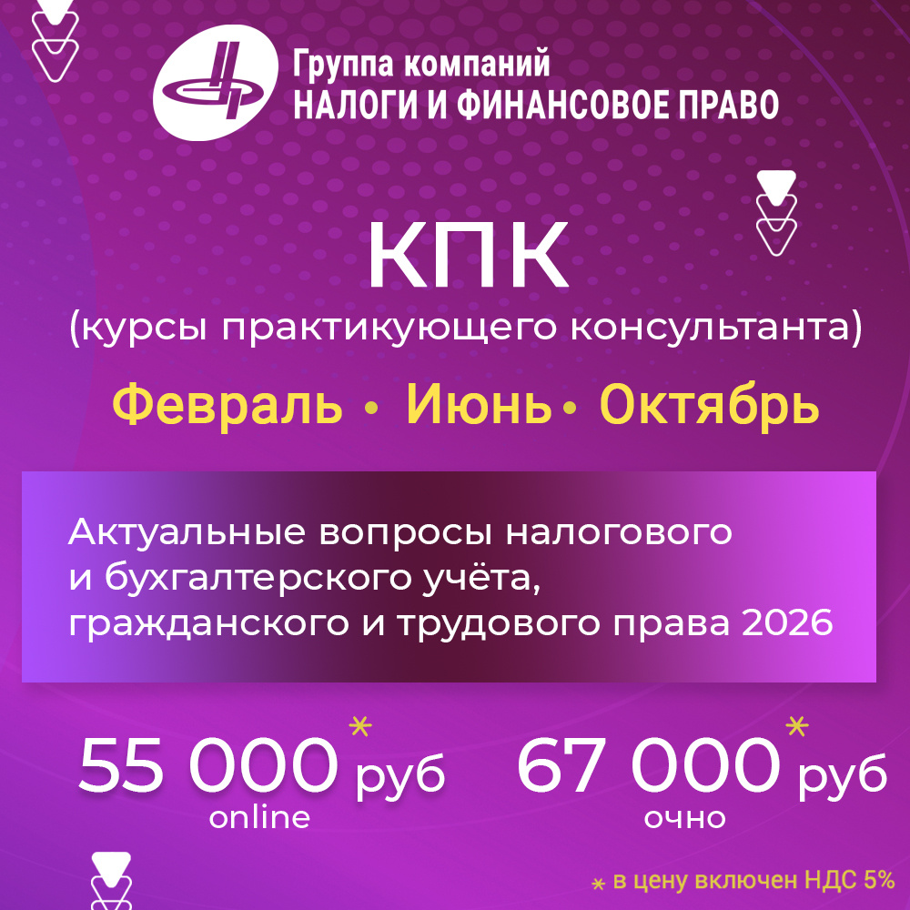 Коллеги, 9 февраля стартует первый в 2026 году Курс Практикующего Консультанта (КПК)! Программа готова и скоро будет размещен анонс. На Курсах Практикующего Консультанта наши лекторы дадут только актуальную информацию точно и по делу и, конечно, отвечают на все вопросы слушателей. Отметьте даты КПК в календаре: 9-11 февраля: Актуальные вопросы налогового и бухгалтерского учёта, гражданского и хозяйственного права. Посмотреть пример программы 2025 года. 15-17 июня: Актуальные вопросы налогового и бухгалтерского учёта, гражданского и трудового права. Посмотреть пример программы 2025 года. 12-14 октября: Актуальные вопросы налогового и бухгалтерского учёта, гражданского и трудового права. Посмотреть пример программы 2025 года. Все участники курса получают свидетельство, материалы спикеров и записи лекций. Наш курс доступен в очном и on-line форматах: