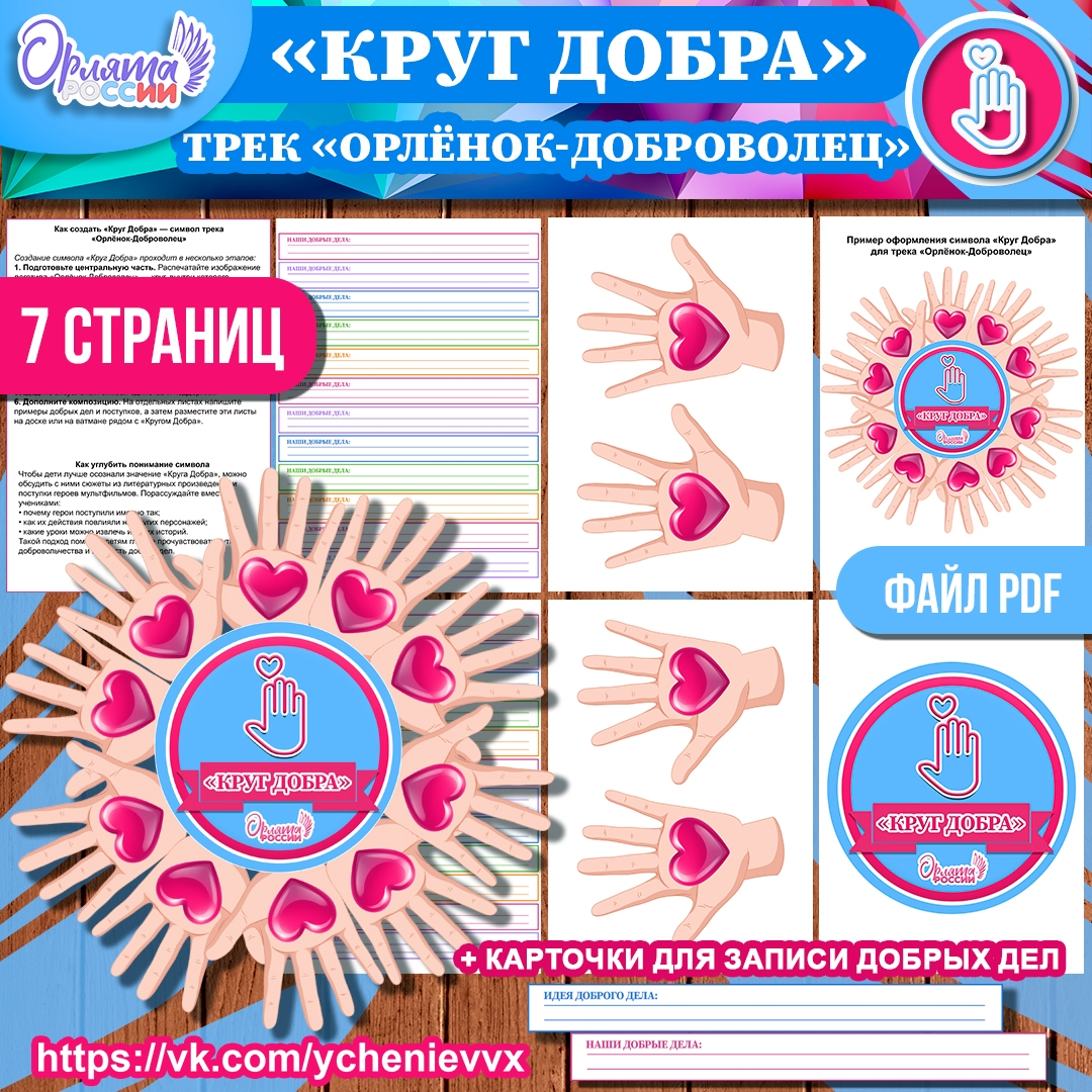 Данный комплект материалов поможет создать символ «Круг Добра» в рамках трека «Орлёнок-Доброволец» программы внеурочной деятельности «Орлята России». Весь материал представлен в формате PDF и состоит из 7 листов формата А4. 📔 Содержание комплекта: Лист 1: Изображения ладоней правой руки — распечатываются в количестве, соответствующем числу учеников в классе. Лист 2: Изображения ладоней левой руки — распечатываются в количестве, соответствующем числу учеников в классе. Лист 3: Логотип трека — изображение круга с ладонью, дополненное надписями «Круг добра» и «Орлята России». Лист 4: Бланки «Идеи добрых дел» — дети смогут записать свои идеи. Лист 5: Бланки «Наши добрые дела» — дети смогут записать свои добрые поступки. Лист 6: Инструкция по созданию «Круга Добра» — описание всех этапов работы. Лист 7: Образец «Круга Добра» — поможет визуализировать итоговый результат. Этот комплект поможет ярко и наглядно воплотить идею добровольчества, объединив усилия детей в создании символа добрых де