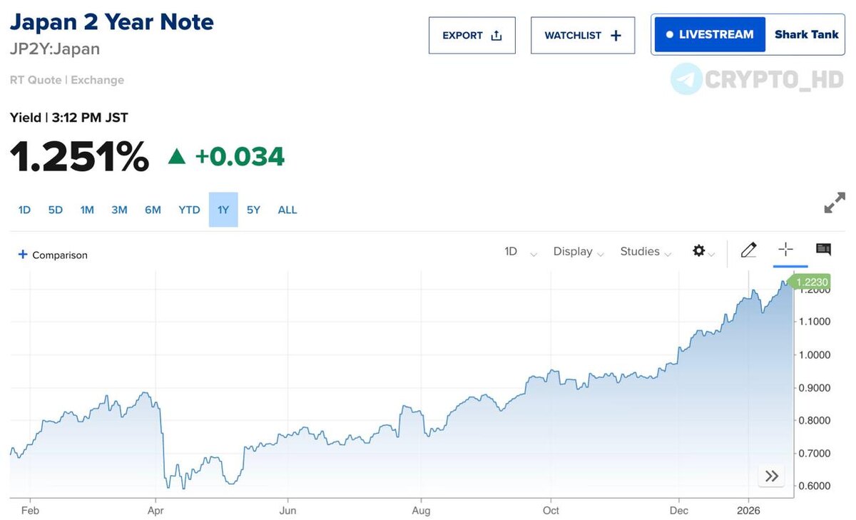 🎯 Доходность 2-летних японских гос. облигаций взлетела до 1,25% – максимум с 1996 года. ЦБ Японии сегодня оставил процентную ставку без изменений, но дал сигнал на потенциальное повышение в будущем. 📌 Влияние решений ЦБ Японии на крипторынок: исследование Ранее: японский рынок облигаций бьет по крипте Crypto Headlines