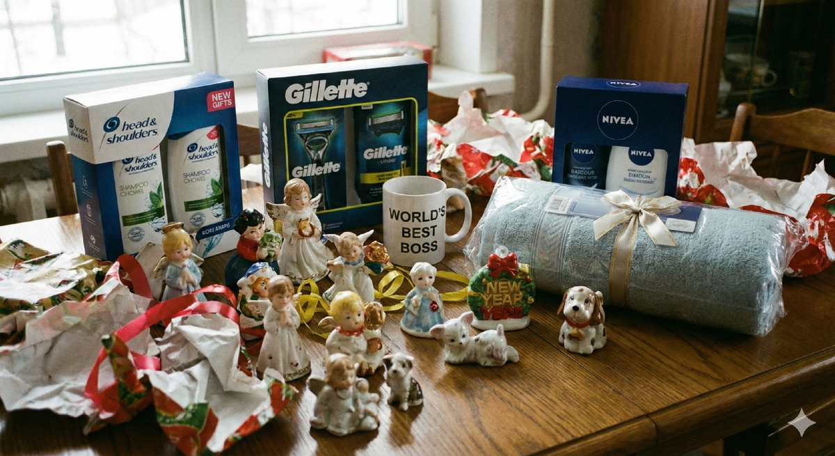 Когда коллега покупает 15 одинаковых наборов мыльно-рыльных принадлежностей в супермаркете по акции — это не «от души». Это «для галочки». Это социальный ритуал, чтобы не выглядеть букой.