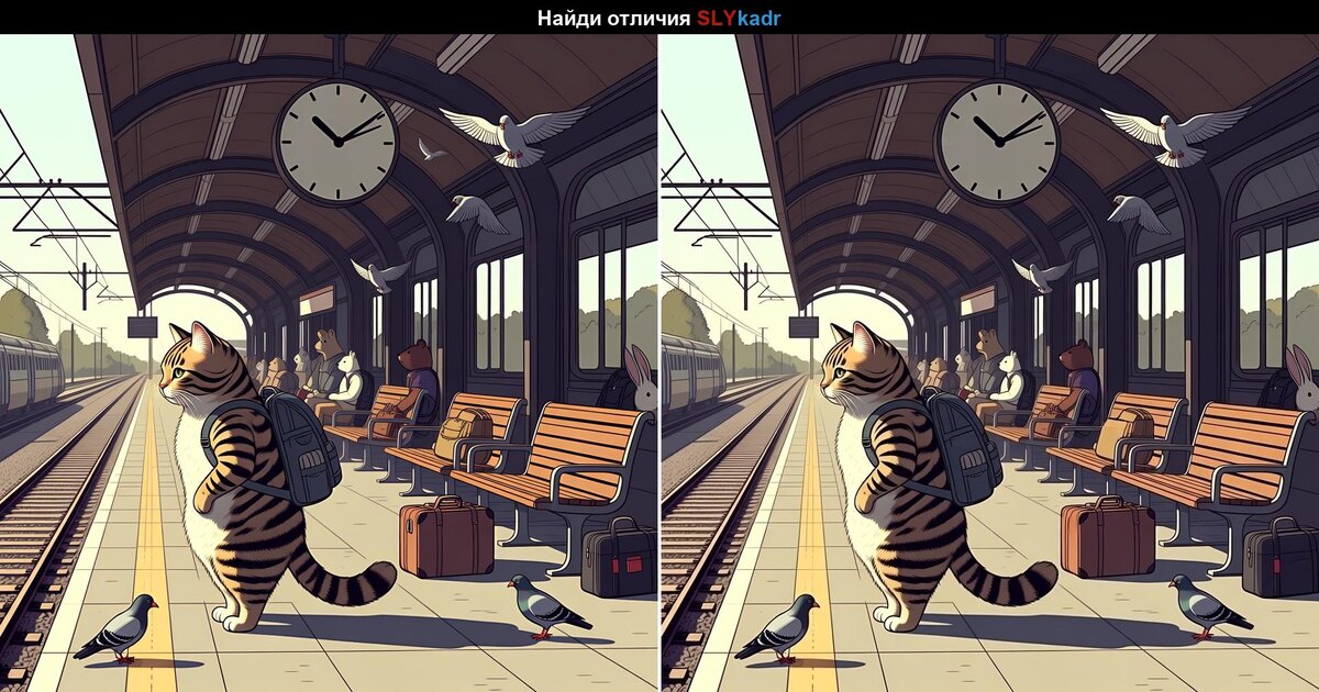 На этой платформе всё выглядит спокойно: поезд вот-вот прибудет, пассажиры ждут, часы идут… Но не спешите — в этой картинке спрятались отличия.