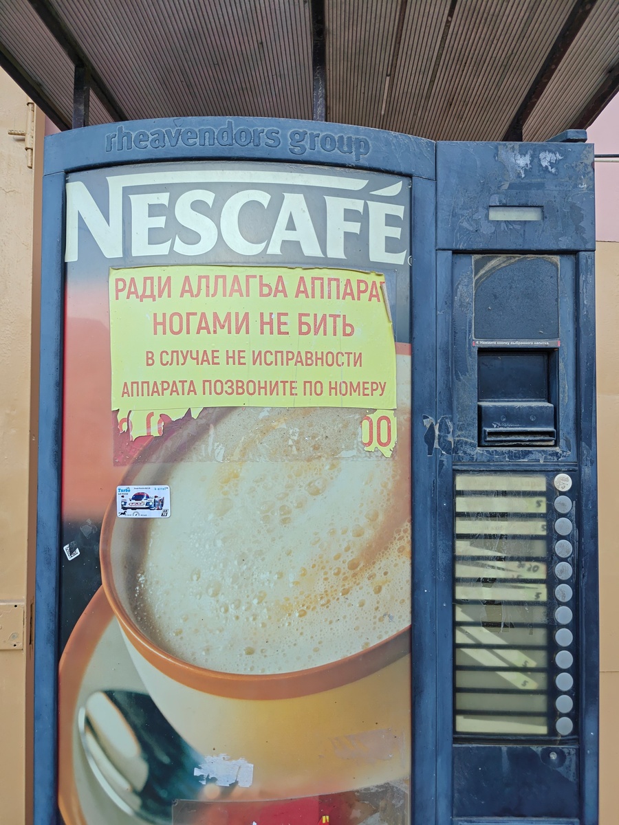! Вот такой вот кофе-аппарат стоит где-то в горном Дагестане. И объявление на нём меня просто убило минут на пять. Цитата: «Ради Аллаха аппарат ногами не бить. В случае неисправности аппарата позвоните по номеру...» ...но номер предусмотрительно кто-то оторвал 😂 Наверное, всё-таки цель этого аппарата — не кофе давать, а оттачивать ударные приёмы. Или проверять, насколько у вас крепкие нервы (и ноги). А если серьёзно — это же чистейший слепок нашей реальности: где просьба о человечности соседствует с вандализмом, а юмор рождается прямо на грани абсурда. И где даже в горах, среди всей этой суровой красоты, люди всё равно хотят кофе. Просто иногда очень эмоционально. Всем добра, терпения (особенно к кофе-аппаратам) и отличных выходных! ❤ #Дагестан #Кофе #Юмор #Объявление #Аппарат #Позитив #Выходные #ГорныйДагестан #Находка