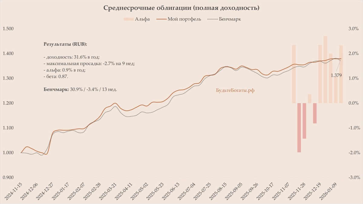 Январь 2026. 31.6% в год с просадкой до минус 2.7% на 9 недель. Бенчмарк: 30.9% / -3.4% / 13 недель. Мой портфель лучше. Хорошо бы всегда так на облигациях зарабатывать. Но увы – только в начале смягчения ДКП 😊 ЗЫ. После её ужесточения соответственно. Что тоже не проходит бесследно. -- Не является индивидуальной инвестиционной рекомендацией. Инвестиции сопряжены с риском. Доходность не гарантирована и может отличаться от ожидаемой. #Среднесрочные_облигации_Верещак This post 🇬🇧 in English.