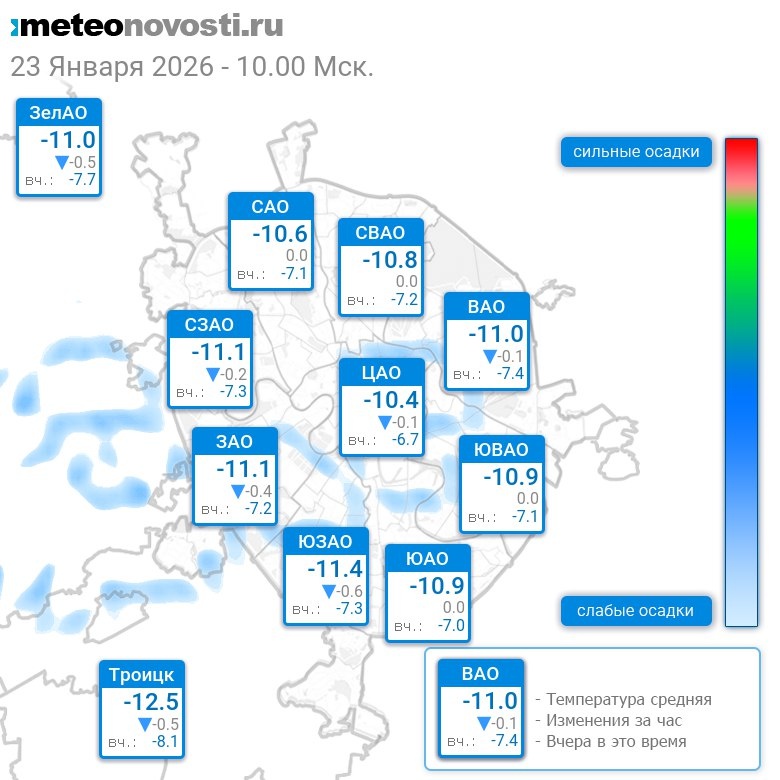 В 10:00 в Москве было от -12.5°C до -10.1°C, средняя температура -10.8°C #погода #Москва #зима #температура #23января #пятница