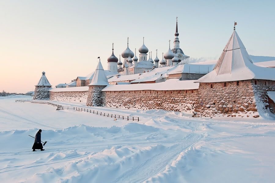Представьте: морозное зимнее утро, небо окрашено в нежные пастельные тона рассвета, а вокруг — бескрайние снежные просторы. Перед вами величественно возвышается Спасо-Преображенский Соловецкий ставропигиальный мужской монастырь — жемчужина Русского Севера, окутанная атмосферой древней тайны и духовного величия.