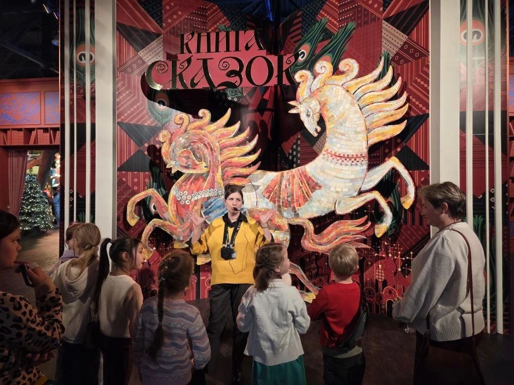 Ученики 1-В класса посетили выставку "Книга сказок" в Национальном центре Россия, о которой рассказывает Оксана Николаевна Прокофьева, классный руководитель. Выставка большая, очень красочная, интерактивная. Начинается она с Библиотеки-сокровищницы Жар-птицы: здесь собраны изделия и предметы из разных регионов России. Потом вас ждут встречи с регионами России, и становится понятно, что каждый имеет свои традиции, ремесла, историю. Ставропольский край - это Лермонтов, Нарзан, горы; Карелия - это Калевала, Вайнемёйнен, мельница Сампо; Рязань - это Есенин, березы и гордое звание новогодней столицы 2026 года; Коми - это лесные ритмы и предания; Ямало-Ненецкий округ - тундра, легенды и полезные ископаемые; Вологодская область - вологодские кружева; Мордовия - яркие узоры и обереги; Калининград - янтарь и хомлины. В каждом зале очень много интерактива: говорящие кочки, двигающаяся Баба-Яга, VR-очки в вездеходе, сказочные герои, фото с помощью искусственного интеллекта, рисование на планше