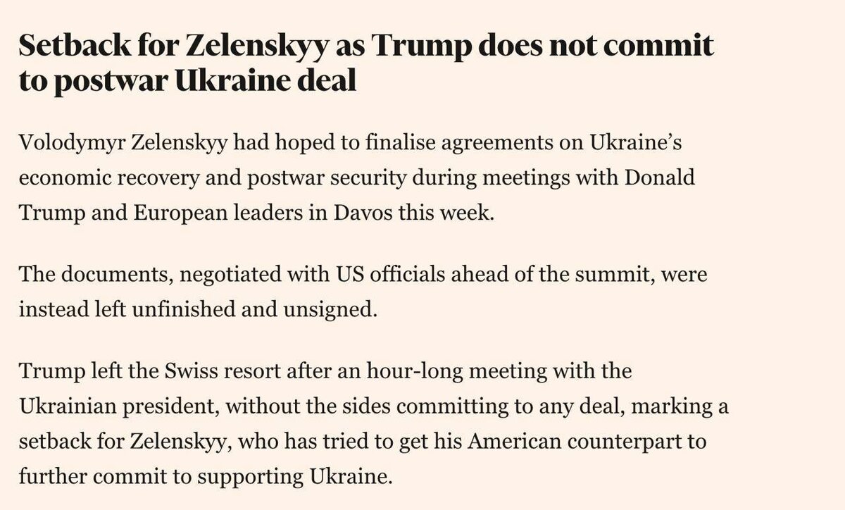 восстановлению страны, пишет Financial Times. Стороны не завершили работу над документами, которые американские и украинские чиновники согласовали перед саммитом, и не подписали их, сообщает издание. Трамп покинул Давос после часовой встречи, на которой так и не было достигнуто соглашение, что, как пишет газета, «стало неудачей для Зеленского, который пытался убедить американского коллегу в поддержке Украины». 🤗 НАСОНОВ 🔴