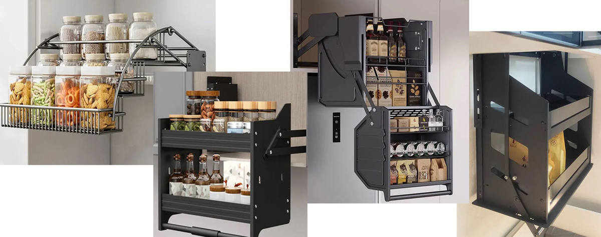 Простые конструкции выдвигаются вперед и опускаются в низ за счет рычагов, необходимые продукты и принадлежности окажутся буквально под рукой. Предназначены для хранения баночек и бутылочек со специями и соусами. За счет простой конструкции она занимает немного места и может размещаться в узких от 33 см и высотой 23 см шкафах благодаря удобной конструкции. Конструкции выполняются из стали, устойчивой к коррозии и рассчитанной на длительную эксплуатацию.