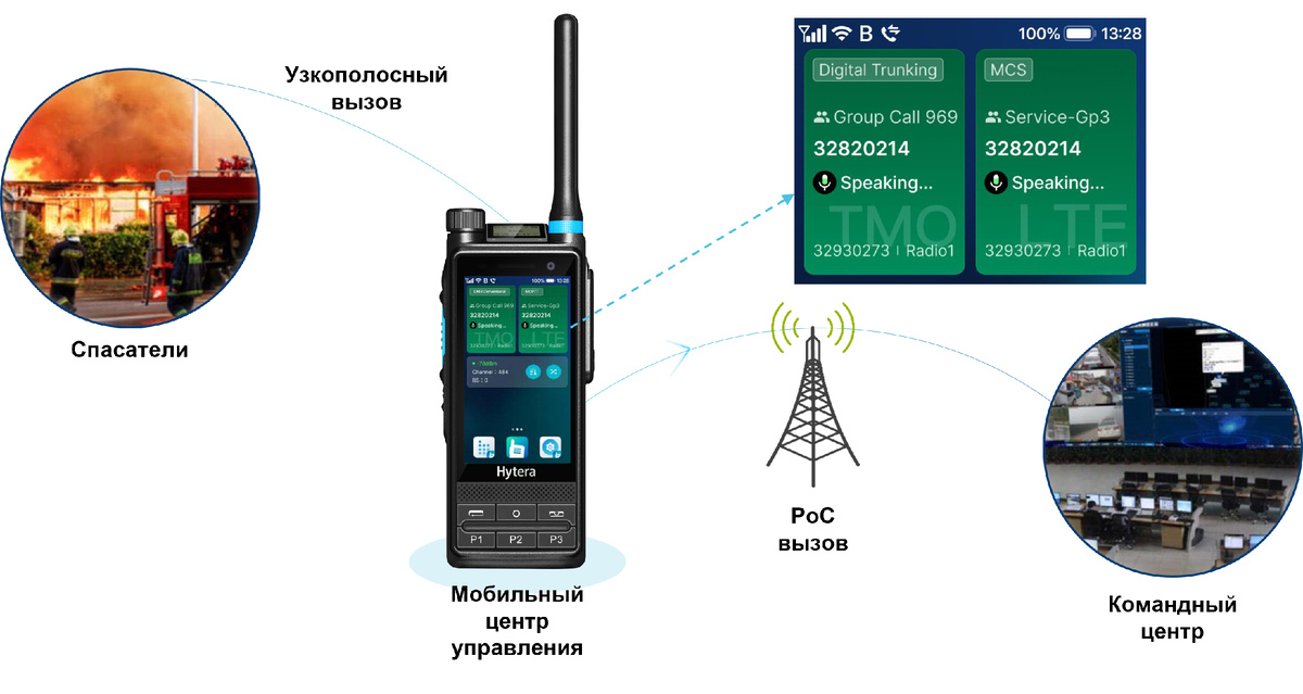 - Аварийную группу на месте ЧС, оснащённую мультирежимными терминалами Hytera PDC680, которые работают в LTE-сети и передают видео и геолокацию.