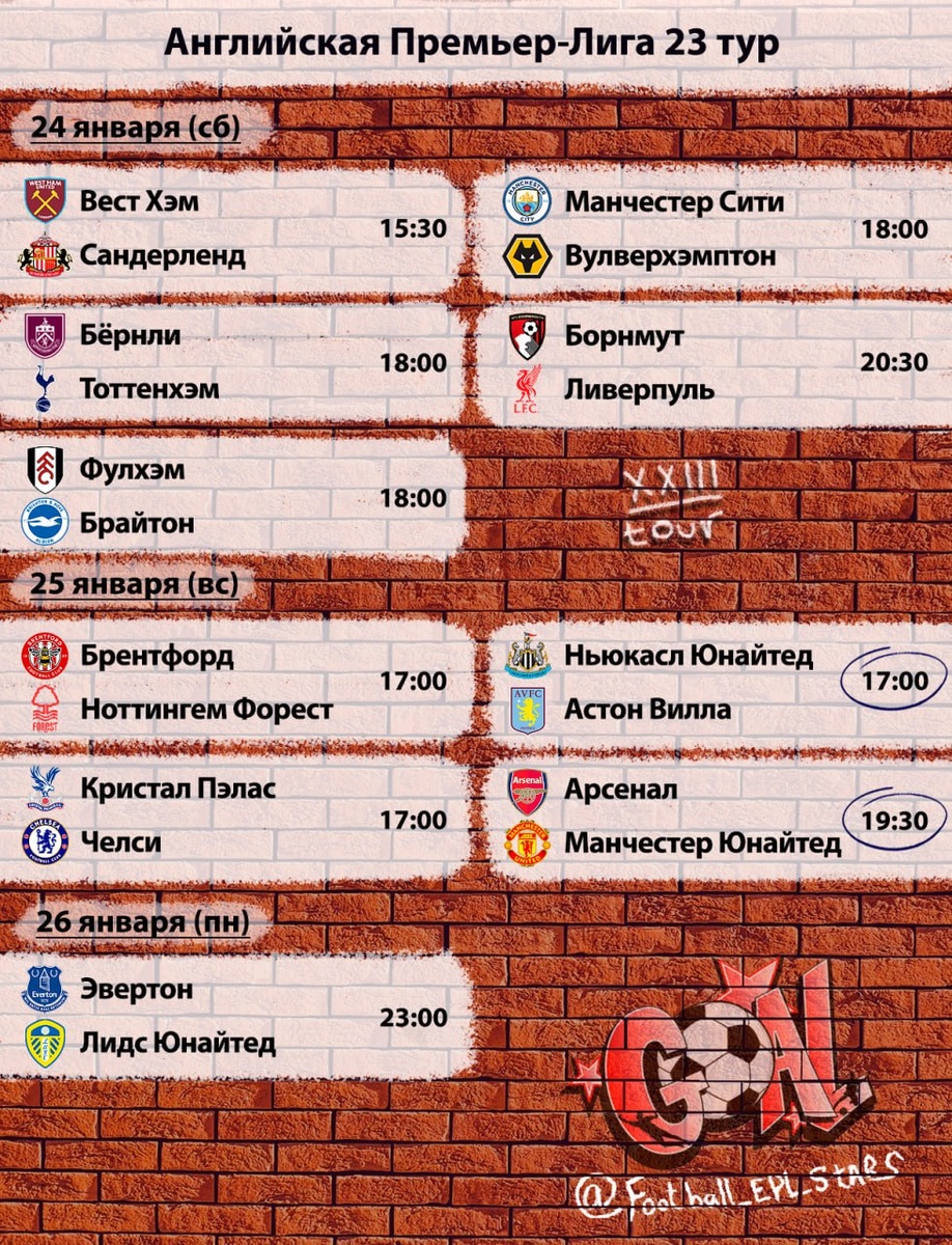 Расписание матчей 23-го тура АПЛ.