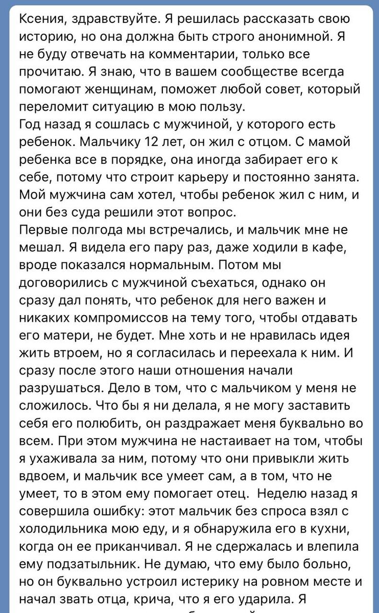 ) Коллеги, отдаю вам ситуацию на полный аутсорс. Поста с моим мнением не будет, ибо я предпочитаю не связываться с историями, где фигурирует дети. Суть Автор переехал к своему мужчине, который живет с двенадцатилетним сыном. Мальчик раздражает автора. Однажды нона увидела, что он ест ее еду без спроса и дала подзатыльник. Мальчик позвал отца, а тот в свою очередь дал автору две недели, чтобы съехать. Вопросы автора Как вести себя с ребенком и с мужчиной, чтобы наладить отношения после конфликта? П. С. Из другого сообщения автора — ей 26, своих детей нет, бюджет с мужчиной частично общий (она иногда покупает еду и платит за развлечения за двоих, остальное — на нем).