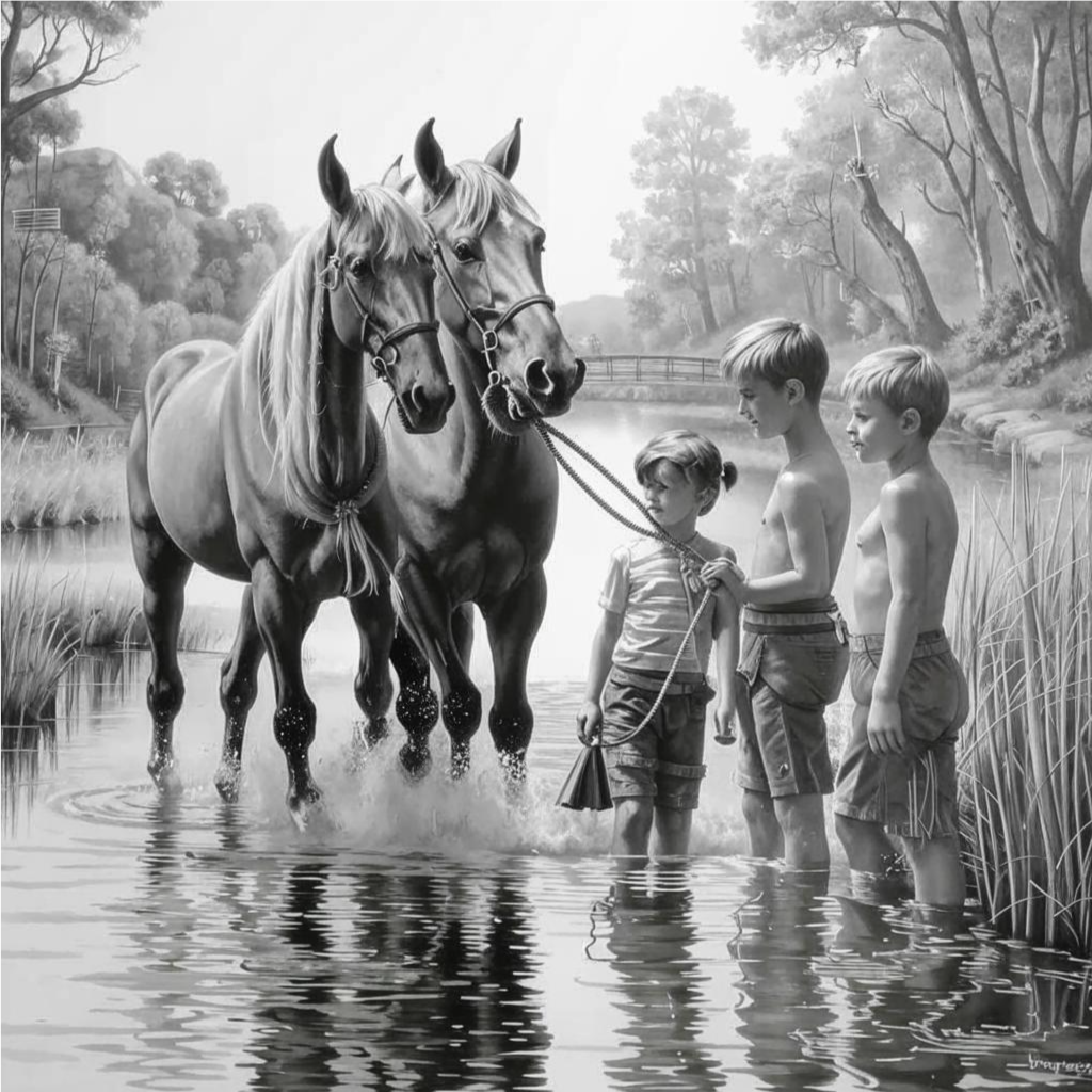 Ещё мы с ребятами катались на лошадях. Нам даже доверяли их купать и мыть специальными скребками и ещё гриву расчёсывать. После того, как накупаем - скакали по лугу. Вот только седла у нас не было, одна уздечка, и поэтому, когда я вечером приходил домой, сесть у меня уже не получалось. Лошади очень красивые, умные и добрые. Только к ним сзади подходить нельзя – не любят они этого. Я однажды подошёл и получил копытом. Не очень больно, только отлетел недалеко и всё. Хорошо, что это жеребёнок был, если бы взрослый конь, то отлетел бы намного дальше.