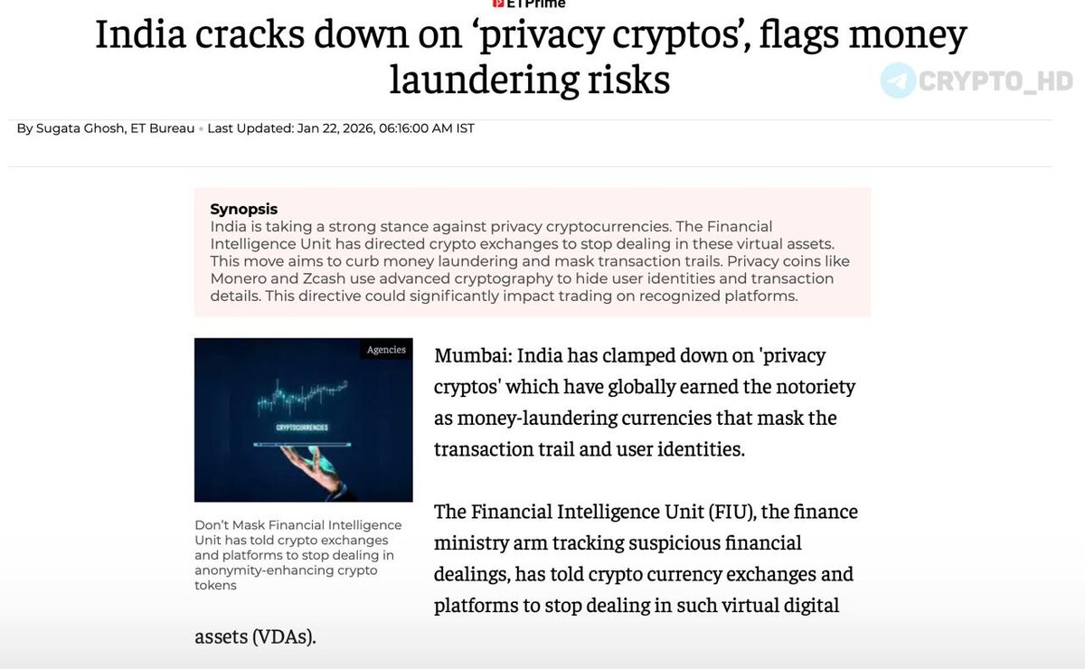 Финансовый регулятор Индии (FIU-IND) ужесточил требования к криптобиржам – запрещают листинг монет, ориентированных на конфиденциальность, по типу Monero (#XMR), Zcash (#ZEC), Dash (#DASH) и других. Причина: риски отмывания денег, подобные активы сложнее отслеживать, а значит регулятор считает их небезопасными для легального рынка. Что означает: делистинги приватных монет и ограничения на индийских биржах, усиление KYC/AML, давление на миксеры и инструменты анонимизации. Crypto Headlines