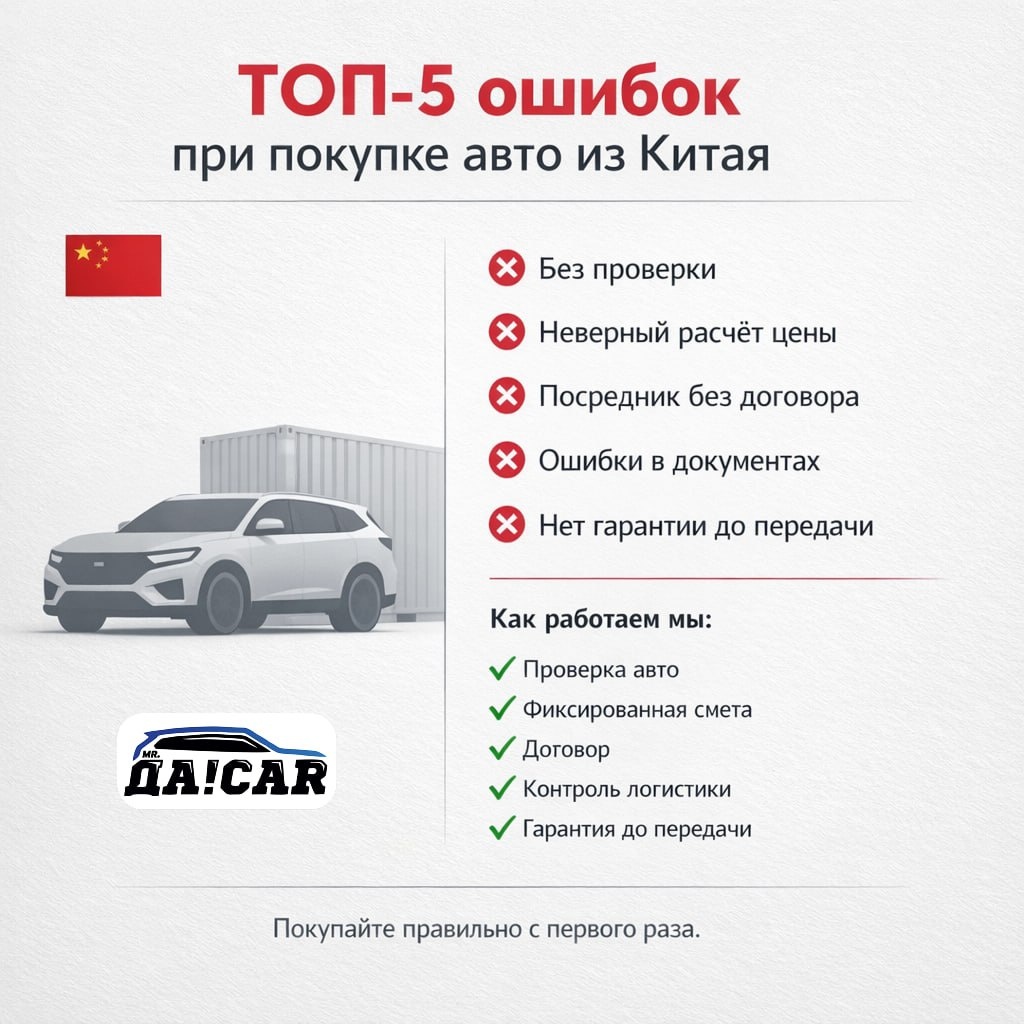 🇨🇳 Покупка кажется простой, но на практике часто выходит дороже 👇 1️⃣ Без полной проверки Фото не значит реальность, ибо могут быть скрытые дефекты, ДТП, ограничения на экспорт. 2️⃣ Непонимание итоговой цены К "выгодной" стоимости добавляются логистика, комиссии, документы, таможня: к итоговой цене + сотни тысяч ₽. 3️⃣ Посредники без гарантий Если нет договора, то нет и ответственности, защиты денег. 🔴 Ошибки в документах Задержки, штрафы, простой на таможне и лишние расходы. 5️⃣ Нет гарантий до передачи авто Любые повреждения – за Ваш счёт. Как работаем мы: ✔️ Полная проверка авто ✔️ Фиксированная смета ✔️ Договор и ответственность ✔️ Контроль логистики и документов ✔️ Гарантия возмещения ущерба до передачи авто ✍️ Планируете авто из Китая — лучше сразу делать правильно. Связаться с менеджером - @mrdacar_help 📝 Дзен 📺 YouTube 🌐 Наш сайт 💙 ВКонтакте 📧 Почта для связи: MrDaCar@yandex.ru 💫 Есть вопросы? Позвоните нам — 89246840004 (Telegram, WhatsApp)