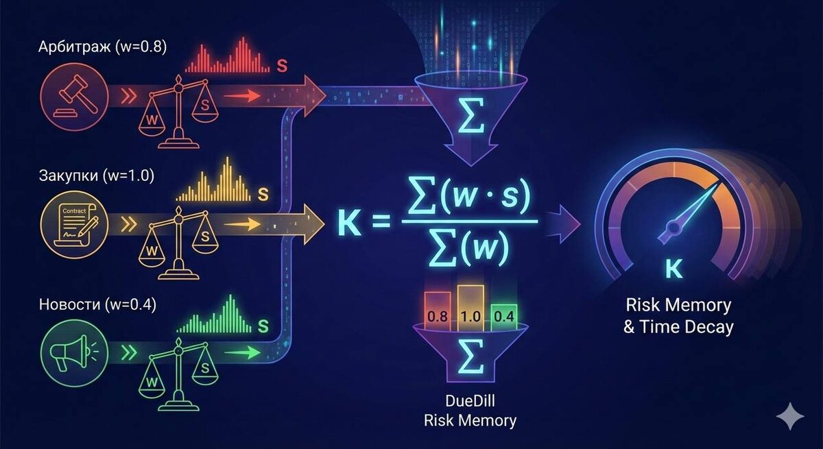 В проверке контрагентов есть вечная проблема: информационный шум. Система часто выдает одинаковый «ахтунг!» и на пустую сплетню в СМИ, и на реальный судебный иск. Когда всё вокруг красное, глаз замыливается. Риск-менеджер либо перестраховывается и блокирует нормальные сделки, либо просто перестает верить уведомлениям. В Тендерботе в блоке юррисков мы решаем это через модуль Risk Memory и расчет понятного индекса Как это работает? (взгляните на картинку) Мы не просто суммируем «плохие новости». Мы присваиваем каждому источнику свой вес (w) и оцениваем силу сигнала (s). Разные потоки данных стекаются в единую воронку. Формула простая: мы считаем средневзвешенное значение, где значимость источника определяет итоговый результат. • Арбитраж и Закупки — это тяжелые гири на чаше весов. • Новости и СМИ — это важный, но более легкий контекст, который не должен «перевешивать» факты. Почему индекс «живой»? 1. Самокалибровка: Веса не застыли в камне. Если конкретный тип сигналов часто дае