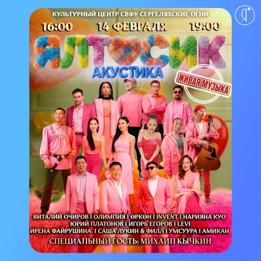 Акустика #Концерты Самый нежный концерт с участием любимых якутских звезд: Умсуура Виталий Очиров Олимпия Invent Өркөн Нарияна Куо Юрий Платонов Игорь Егоров Ирена Файрушина Саша Лукин & Филл Amikan Levi Специальный гость: Михаил Кычкин 14 февраля | 16:00 | 19:00 КЦ «Сергеляхские огни», Белинского, 58 От 1500 руб. Подробнее Online Якутия | Ждем вас в МАХ