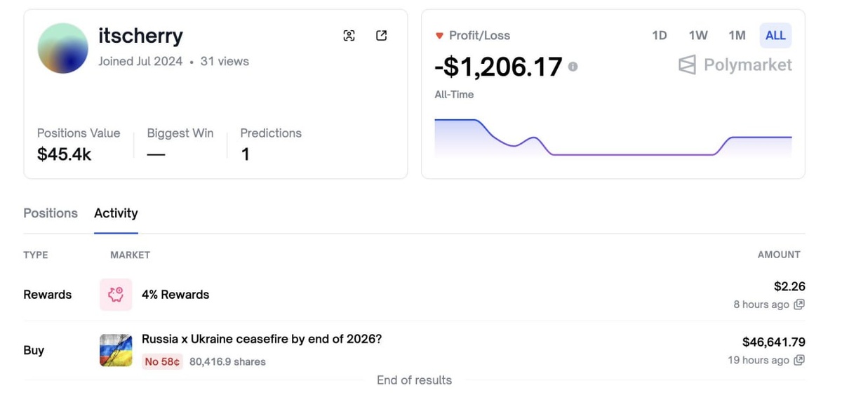 Сегодня он внезапно потратил $46,6 тыс., сделав ставку на исход: «Россия × Украина — перемирия не будет до конца 2026 года».