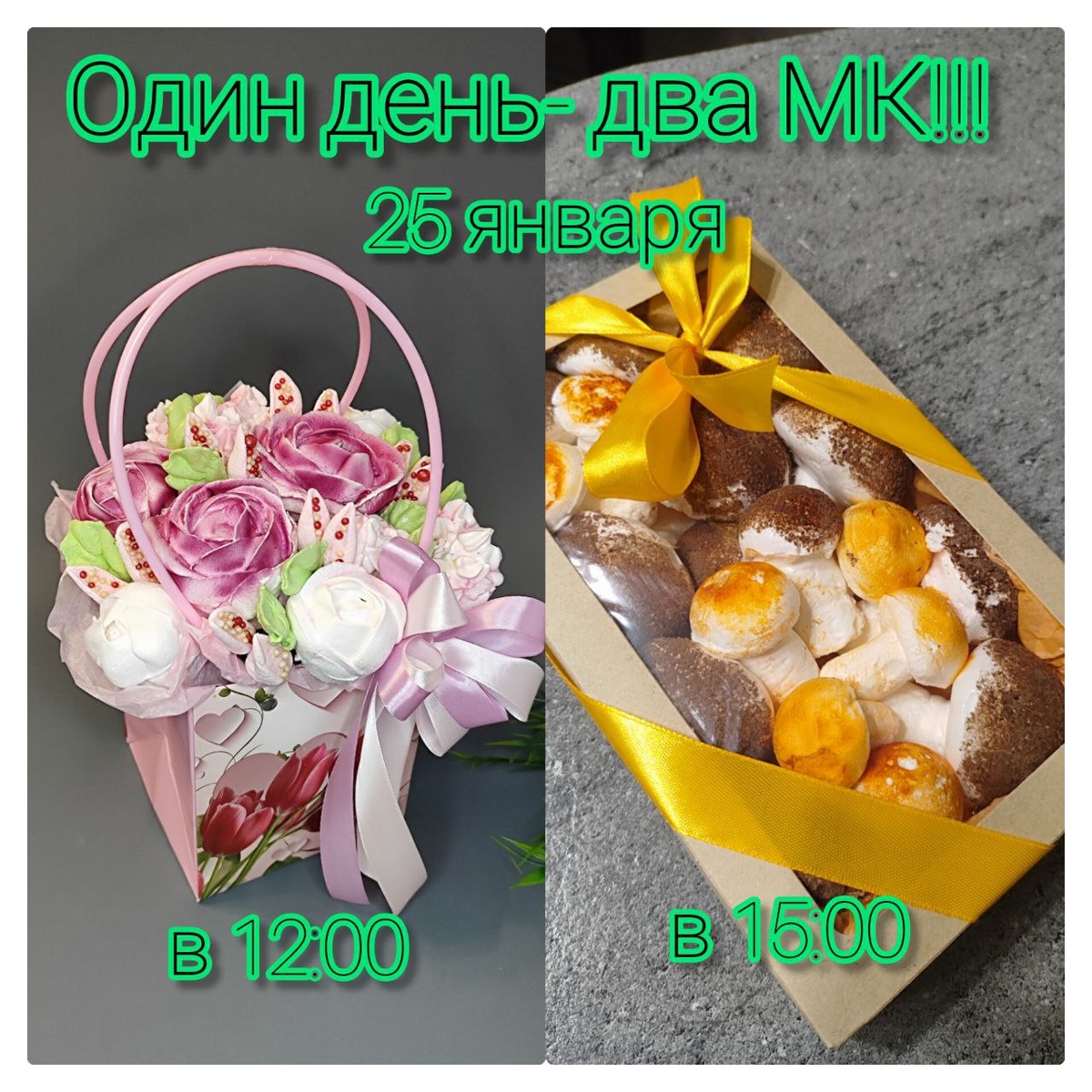 ! 🎨 1⃣2⃣:0⃣0⃣ - "Сладкая нежность в Татьянин день" Соберите роскошный букет из воздушного зефира и маршмеллоу. Изучите все секреты композиции. 💯Идеальный подарок, который вы создадите своими руками! 💝 Стоимость: 1500,00 🎨 1⃣5⃣:0⃣0⃣ - " Зефирные грибочки" Научитесь создавать удивительно реалистичные зефирные грибочки, а затем соберите из них стильную и вкусную композицию-букет. Идеальный подарок для тех, кто ценит ручную работу и необычные десерты. 💝 Стоимость: 1000,00 Почему это нужно именно вам? ✅Унесёте с собой два шикарных, впечатляющих букета, созданных вами. ✅️ Получите море вдохновения и все навыки для творчества дома. ✅ Это яркие эмоции, новый опыт и фото для соцсетей, которые соберут десятки восторженных комментариев! ✅Мы предоставляем все материалы: свежайшие продукты, упаковку, инструменты и наше экспертное руководство. ❗❗❗Мест всего 6 на каждый МК! ❗❗❗ 🔗 Забронируйте место сейчас — выберите один МК или посетите оба со скидкой 10%!🔥🔥🔥 📩Для бронирования мес