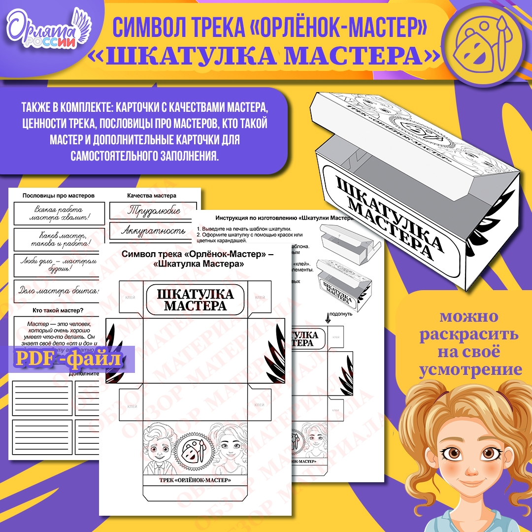 Представляю вашему вниманию комплект, который поможет создать символ трека «Орлёнок-Мастер» - «Шкатулку Мастера». Материал разработан специально для дошкольников и учеников 1–4 классов. Что вы найдёте в комплекте (формат PDF, 3 листа А4): 1. Шаблон для создания шкатулки — яркая заготовка, которую ребята смогут аккуратно вырезать и собрать в настоящую шкатулку своими руками. 2. Пошаговая инструкция по сборке — поможет детям легко справиться с задачей. 3. Набор карточек для наполнения шкатулки, включающий: ✅перечень качеств, которыми обладает настоящий мастер; ✅ключевые ценности трека «Орлёнок-Мастер»; ✅подборку пословиц о мастерах; ✅карточка с разъяснением, кто такой мастер; ✅дополнительные карточки — дети смогут заполнить их самостоятельно. ❗❗ Как получить материал? ПОДРОБНОСТИ ЗДЕСЬ ❗❗ ------------------------------------------- #ОрлятаРоссии #ОрлёнокМастер #трекОрлёнокМастер #внеурочнаядеятельность #движениеОрлят #начальнаяшкола