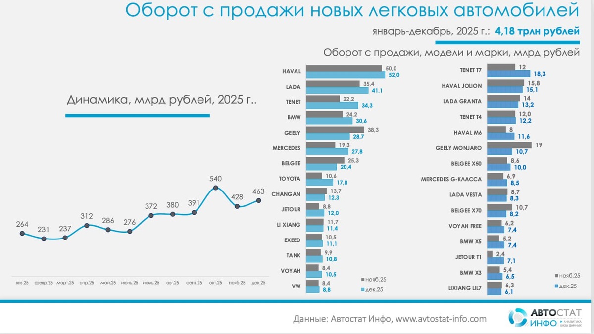По данным «Автостат Инфо» выручка от продаж новых легковых автомобилей в России по итогам 2025 года достигла 4,18 трлн рублей. За январь–ноябрь рынок был на уровне 3,72 трлн рублей, а декабрь традиционно дожал год, добавив еще около 460 млрд рублей. Денежная кривая в течение года заметно «проседает» в конце зимы (минимум около 230–240 млрд рублей в феврале–марте) и начинает устойчиво расти с апреля. Пик приходится на октябрь, когда месячный оборот подскакивает до 540 млрд рублей. После этого в ноябре следует логичная коррекция и затем сильный, хотя не рекордный декабрь. Структура выручки по брендам фиксирует окончательную смену лидерства в пользу китайских марок. По итогам года первую строчку занимает Haval с оборотом около 52 млрд рублей, на втором месте Lada (41 млрд рублей), дальше идут Geely, Tenet, BMW, Mercedes, Belgee, Toyota, Changan и Jetour. В этой десятке только два «традиционных» иностранных игрока вне Китая и один российский бренд, все остальные — китайские. При этом дин