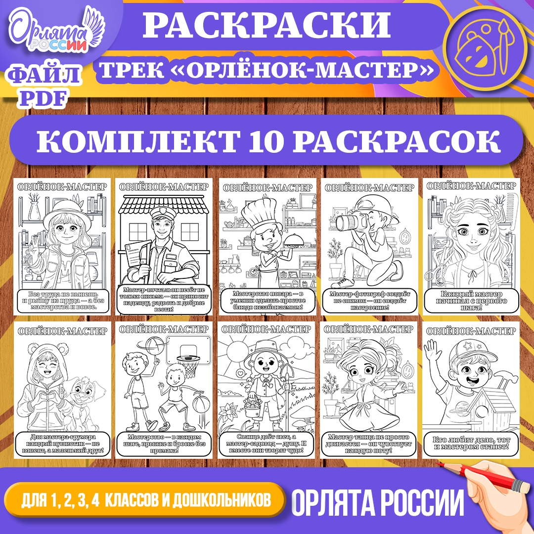 Раскраски «Орлята России»: трек «Орлёнок-Мастер» (в наборе 10 раскрасок) для 1-4 классов или детского сада
