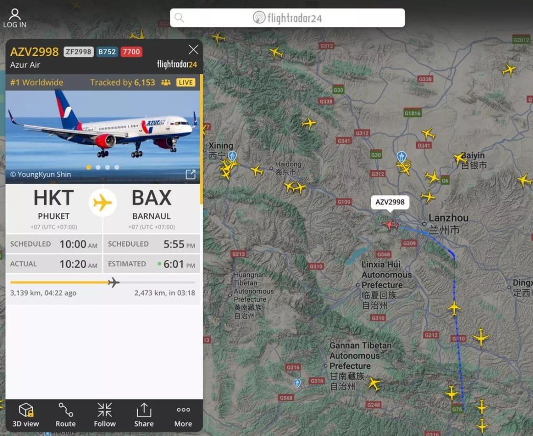 ⚡️Boeing 757 авиакомпании Azur Air, летевший из Пхукета в Барнаул, подал сигнал бедствия над Китаем и готовится к незапланированной посадке