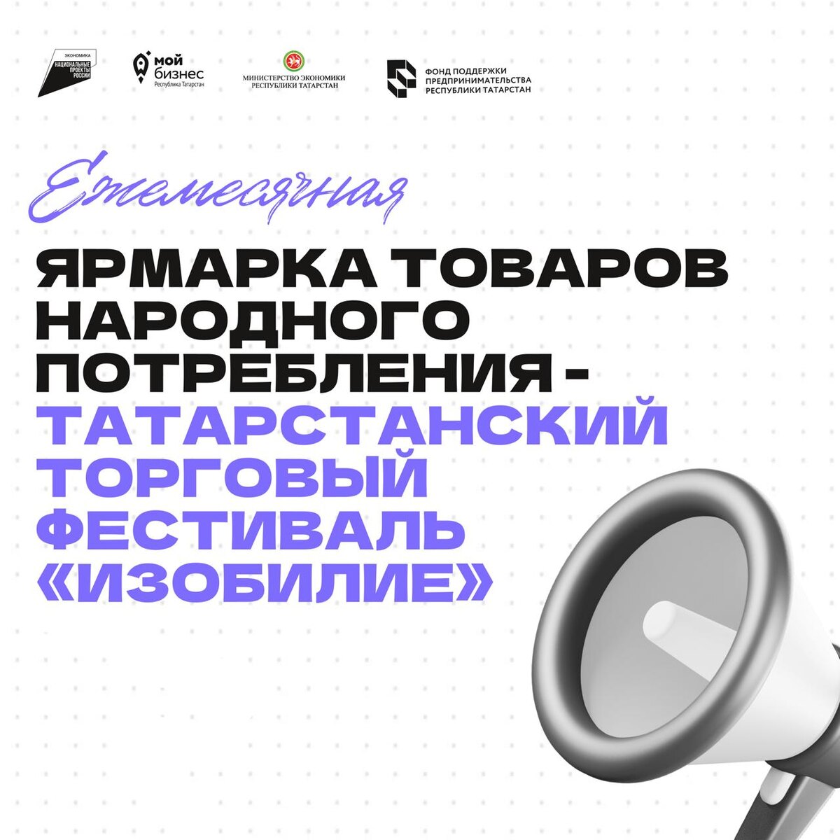 📣 Центр «Мой бизнес» приглашает участников и гостей на ежемесячную ярмарку товаров народного потребления - Татарстанский торговый фестиваль «Изобилие» 📆 С 4 по 8 февраля 2026 года 📍Фойе ГБУ «Дворец Спорта» г. Казани Участие в ярмарке - уникальная возможность для товаропроизводителей и продавцов представить свою продукцию, а для жителей и гостей нашего региона - приобрести качественные товары по доступным ценам! 💼 Организатор: ООО «БАЙРАК» — компания полного цикла, активно поддерживающая развитие выставочно-ярмарочной и конгрессной отрасли в Татарстане. Ярмарка будет широко освещена на федеральных и региональных телеканалах, радиостанциях и других медиа-ресурсах, что обеспечит высокий интерес со стороны потенциальных покупателей 🎉 Цели фестиваля: • Поддержка малого и среднего предпринимательства. • Обеспечение населения качественной продукцией. • Укрепление межнациональных и межкультурных связей. • Создание условий для самореализации молодежи. • Повышение туристического потенциал