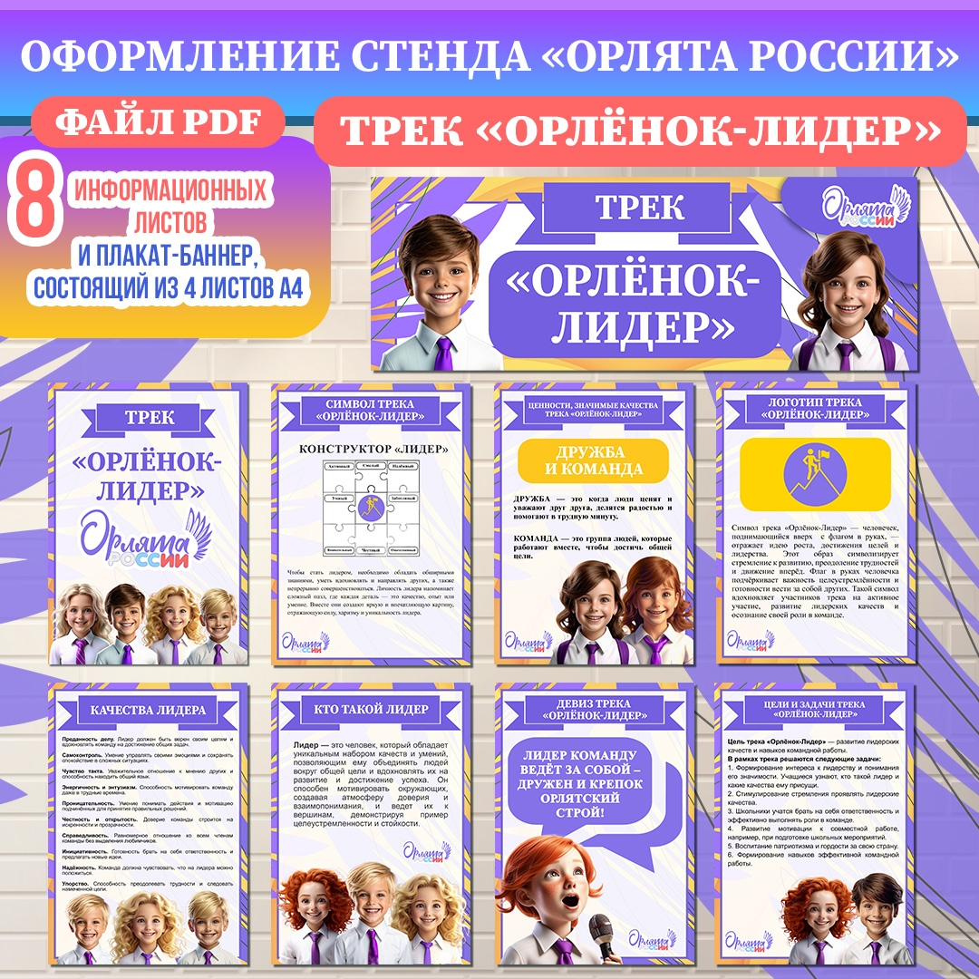 👉 Оформление стенда «Орлёнок-Лидер» — ваш идеальный помощник в создании атмосферы лидерства и развития! Хотите создать вдохновляющее пространство для юных лидеров? Представляем профессиональный комплект материалов для оформления стенда по треку «Орлёнок-Лидер» программы «Орлята России». Материал представлен в PDF-формате для самостоятельной печати. ✅ Что вы получите: • 8 красочных информационных листов формата А4, которые раскроют все аспекты трека: • Трек «Орлёнок-Лидер»; • Ценности, значимые качества трека «Орлёнок-Лидер»; • Логотип трека «Орлёнок-Лидер»; • Символ трека «Орлёнок-Лидер»; • Цели и задачи трека «Орлёнок-Лидер»; • Девиз трека «Орлёнок-Лидер»; • Кто такой лидер; • Качества лидера; • Эффектный плакат-баннер (состоит из 4 листов А4) с ярким оформлением, который станет центральным элементом вашего стенда. 📍 Где разместить: • В школьном классе • На информационном стенде • В библиотеке • В любом образовательном пространстве 📍 Преимущества комплекта: • Готовый дизайн, не т