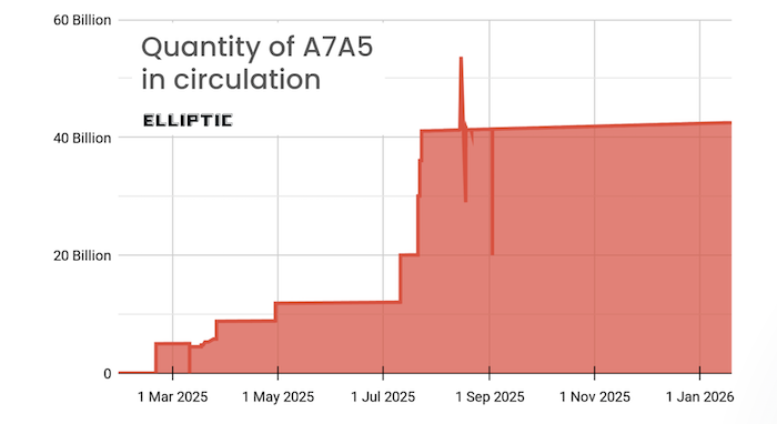 A7A5 функционирует в публичных блокчейнах Ethereum и TRON, что делает транзакционную активность токена доступной для анализа. По данным аналитической комиании Elliptics, с момента запуска совокупный объем транзакций с A7A5 превысил $100 млрд. За этот период было зафиксировано около 250 тыс. транзакций, совершенных с более чем 41 тыс. уникальных адресов.