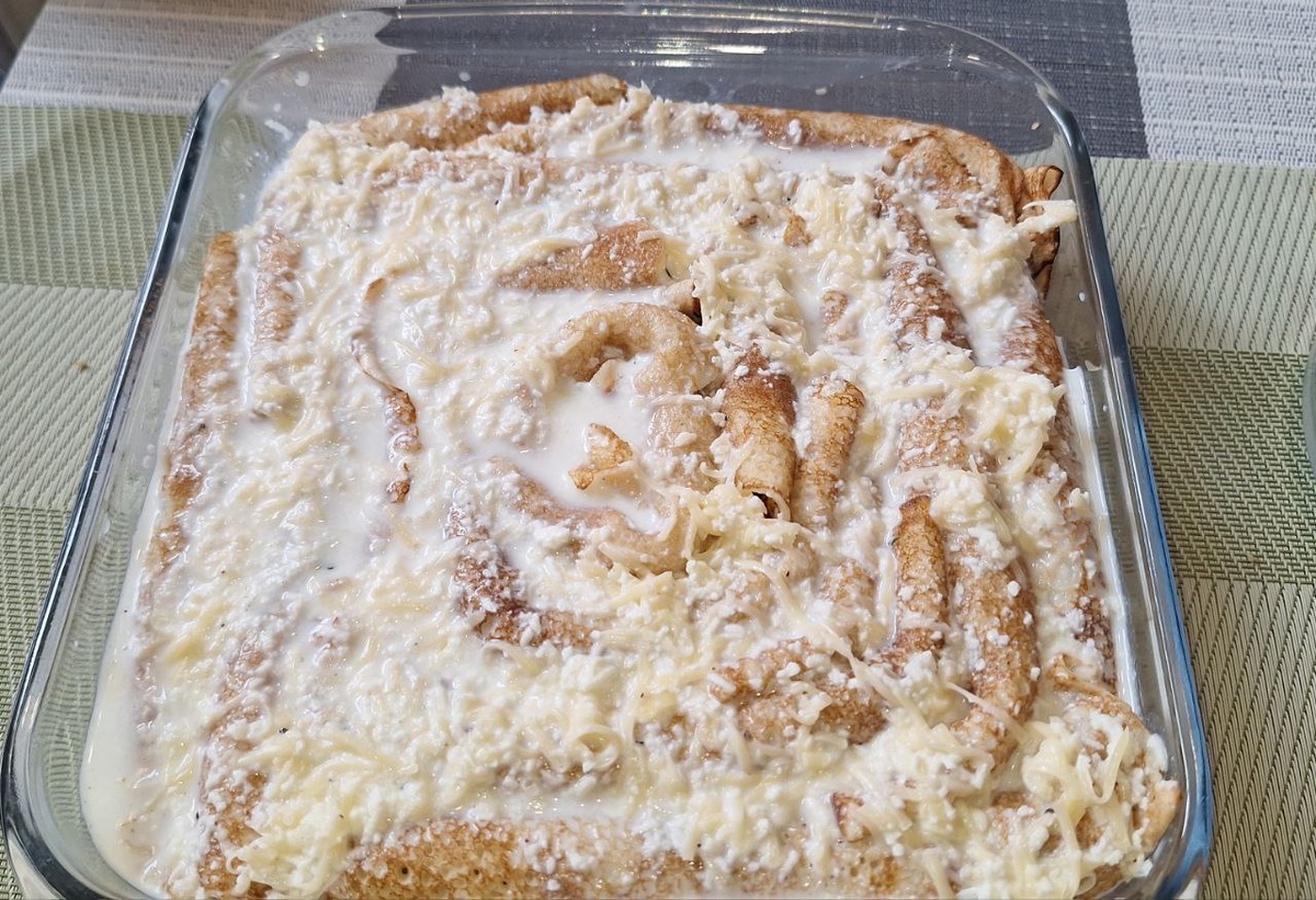 Залейте этим соусом пирог из блинов и ставьте в разогретую до 180С духовку минут на 10-15