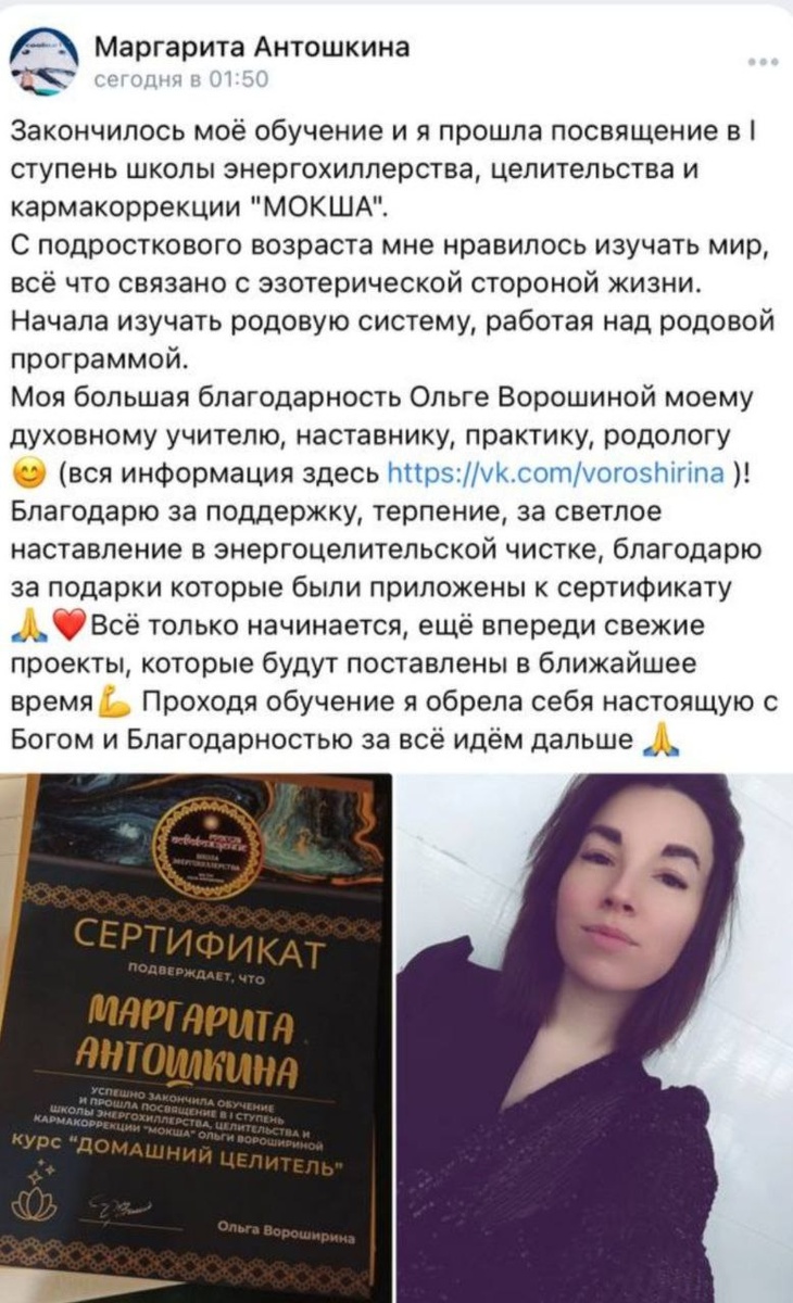 ✨ Мои дорогие 🤍, сейчас у вас есть возможность пройти первую ступень школы целительства «Мокша» ✨, чтобы затем в общем потоке получить вторую ступень в новом, более глубоком формате . В этрм году я даю вторую ступень в новом формате — более глубоком 🔥 Напомню, что я уже выпустила 3 потока целителей первой ступени, и они ожидают вторую 🙏 И у вас есть возможность пройти первую ступень в записи 🎥, чтобы затем в онлайне со мной получить вторую в общем потоке. 💫 Все подробности о моей школе энергохиллерства и кармакоррекции "Мокша" ➡️https://17.olgavoroshirina.ru/moksha По всем вопросам пишите мне в личные сообщения - @Makolya017. С любовью и уважением, Ольга Вороширина