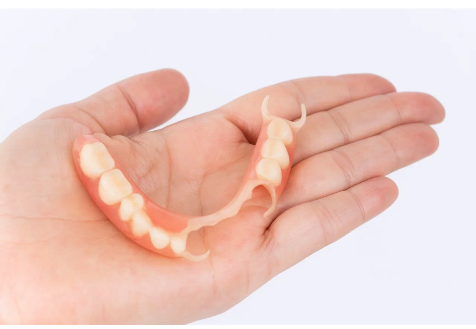 Что это? Протез из пластмассы или нейлона с искусственными зубами и кламмерами (крючками), которые цепляются за оставшиеся зубы.