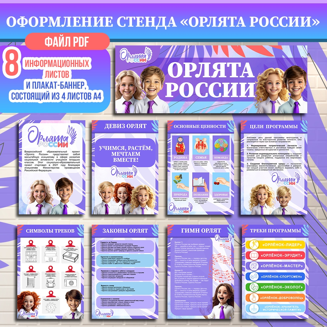 Оформление стенда «Орлята России» (информационный стенд «Орлята России»). Информационные листы и плакат-баннер для классного уголка. 📃 Этот набор станет незаменимым помощником в реализации масштабного проекта «Орлята России». ✅ Предлагаемый комплект содержит: • 8 информационных страниц формата А4 среди которых: 1. Информация о проекте «Орлята России» 2. Треки программы с логотипами 3. Цели программы «Орлята России» 4. Основные ценности 5. Гимн Орлят 6. Девиз Орлят 7. Законы Орлят 8. Символы всех треков • Плакат-баннер с надписью «Орлята России» (состоящий из 4 листов А4). 👉 Материал идеально подходит для: • Оформления классных досок • Создания тематических уголков • Обустройства информационных стендов • Украшения школьных библиотек • Организации тематических мероприятий Комплект, включающий в себя 8 информационных листов, и баннер-плакат представлен в формате PDF. ❗❗ Как получить этот материал? ПОДРОБНОСТИ ЗДЕСЬ ❗❗ ----------------------------------------------- #орлятароссии #Орлят