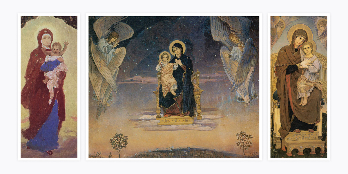 Образ Пресвятой Богородицы глубоко почитается в православном христианстве как символ заступничества и покровительства. Не случайно к нему обращались многие художники, и среди них — Виктор Михайлович Васнецов, для которого религиозная тема стала одной из ключевых в зрелый период творчества. Одним из самых известных религиозных произведений художника является «Богоматерь с Младенцем». К этому образу Васнецов возвращался неоднократно. Первый рисунок был создан в 1871 году во время обучения в Императорской Академии художеств. Позднее, в живописной технике, изображение было повторено в храме Спаса Нерукотворного в Абрамцеве. Окончательно композиция сформировалась в эскизах для Владимирского собора в Киеве, где художник работал с 1885 по 1896 год. И даже после того как Васнецов написал образ «Богоматери с Младенцем» на алтарной стене, он исполнил по меньшей мере два графических (Государственная Третьяковская галерея, Государственный Русский музей) и два живописных варианта (Дом-музей Васнецо