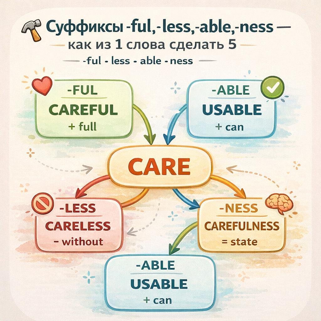 🔨 Суффиксы -ful, -less, -able, -ness — как из 1 слова сделать 5