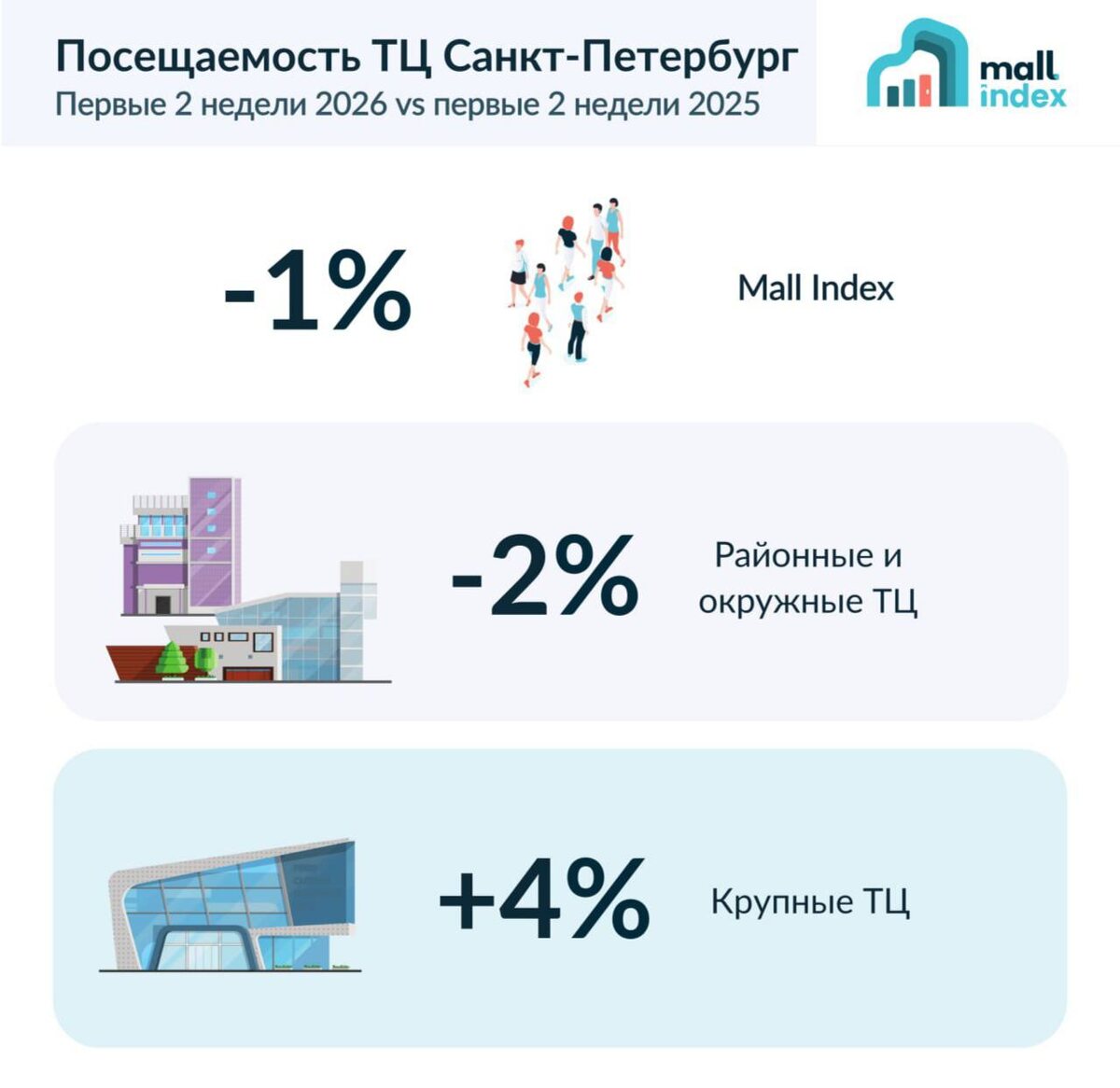 Завершая тему новогодних праздников, рассмотрим ситуацию с трафиком в северной столице России. 🎄 Первые 2 недели 2026 vs первые 2 недели 2025: −1% посещаемость −2% районные и окружные ТЦ (<40 тыс. GLA) +4% крупные ТЦ (40+ тыс. GLA) «Динамика длинных выходных формировалась на фоне более долгосрочных трендов, наблюдавшихся в течение 2025 года, включая сдержанную потребительскую активность. Специфика праздничного периода заключается в том, что в это время усиливаются конкурентные преимущества офлайн–форматов — фактор физического присутствия и связанный с ним эмоциональный компонент» — Михаил Васильев, Focus Technologies «В новогодний период ключевой мотивацией становится совместный досуг, поэтому максимальный трафик получают развлекательные форматы и общепит» — Анна Ходош, управляющая «Охта Молл»