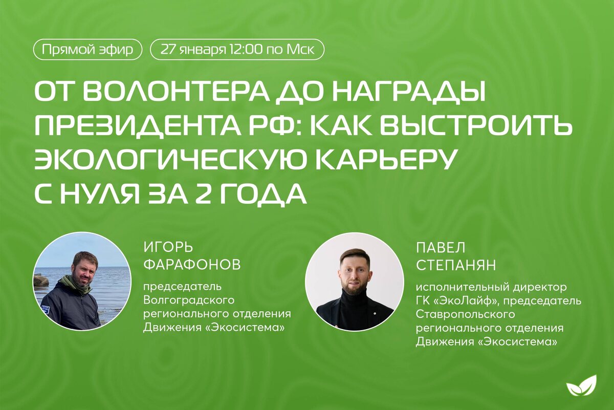 Можно ли, занимаясь экологическим волонтёрством, реально влиять на состояние окружающей среды, работать с бизнесом и быть замеченным на федеральном уровне? Ответ — да. И мы разберём это на реальных примерах в прямом эфире. 27 января в 12:00 поговорим: — как общественные экологические организации влияют на реальные экологические изменения; — с чего начать путь в экоповестке школьнику или студенту и как не «раствориться» в формальностях; — как экологические волонтёры выстраивают эффективное взаимодействие с бизнесом и государством; — какие шаги приводят от инициативы «на энтузиазме» к признанию и высоким наградам. Спикеры эфира: 🎤 Игорь Фарафонов — председатель Волгоградского регионального отделения Движения «Экосистема» 🎤 Павел Степанян — исполнительный директор ГК «ЭкоЛайф», председатель Ставропольского регионального отделения Движения «Экосистема» Если вы занимаетесь экологией, только задумываетесь о волонтёрстве или хотите понять, как экопроекты могут вырастать в системные измен