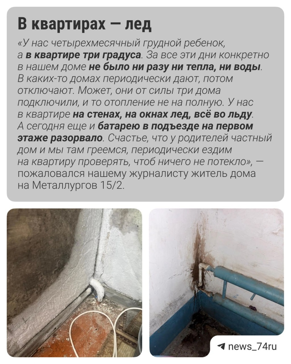 В Карабаше жители нескольких многоквартирных домов четвертый день остаются без отопления и горячей воды Причина — авария на теплотрассе: в квартирах промерзли стены, в некоторых подъездах разорвало батареи. На время аварии жителям предложили разместиться в пунктах обогрева: они работают в школах №1 и №2, также установили три модульные теплые палатки. Собрали рассказы местных жителей в карточки ⬆️ Как сообщили в администрации Карабаша, аварию устраняют 15 бригад, сотрудники МЧС из Троицка и Каслей, а также специалисты «Карабашмедь» и местных управляющих компаний. Всего работают 99 человек и пять единиц техники, в том числе бригады из других городов. На место аварии прибыл заместитель губернатора Андрей Фалейчик. «По состоянию на 14:00 тепло подано в 18 домах, еще 13 подключаются — запуск идет поэтапно. Мы делаем все, чтобы восстановить теплоснабжение как можно быстрее. После пуска проведем поквартирный обход: уточним у жителей возможные завоздушивания батарей и другие нестандартные