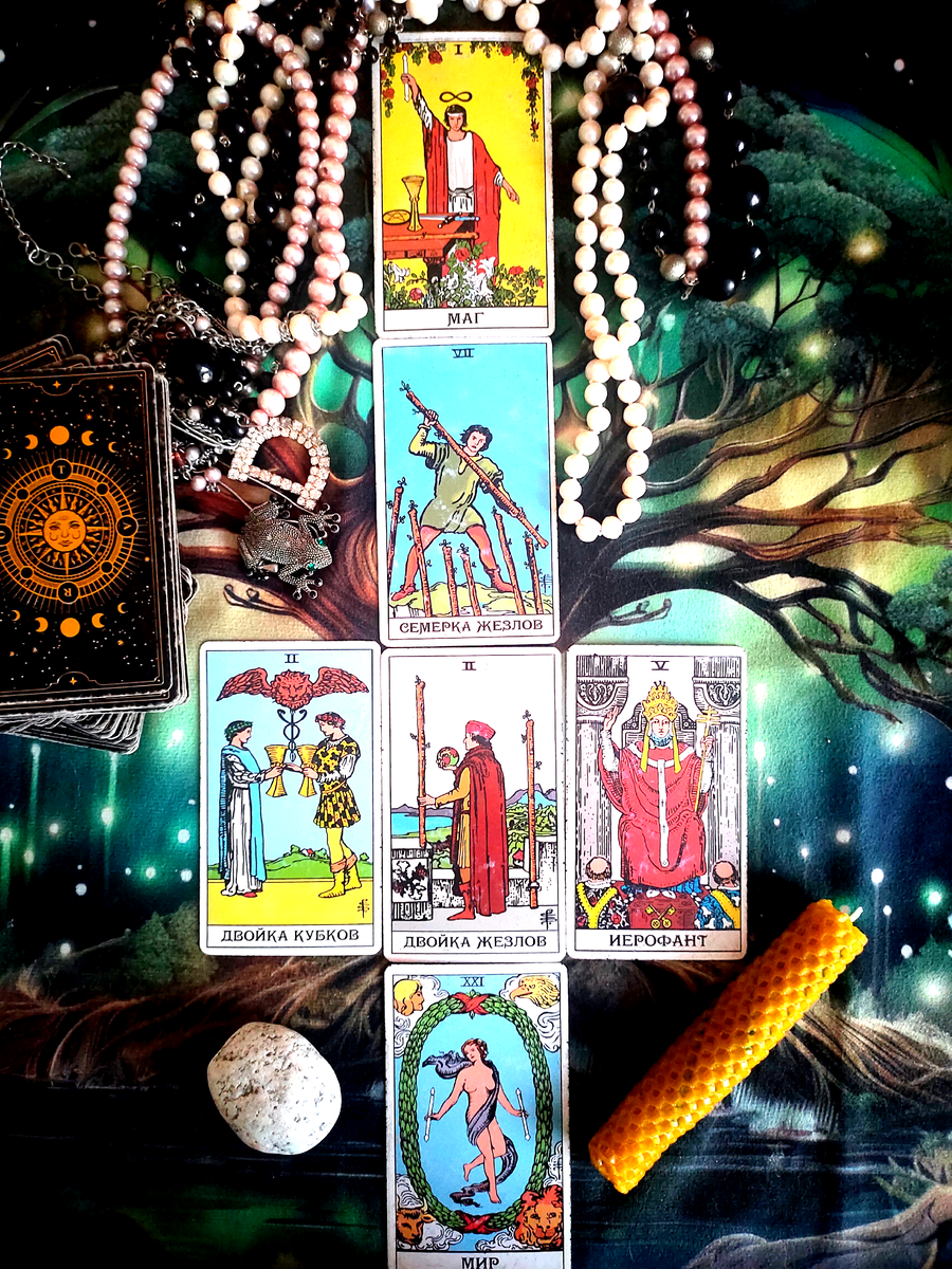 Неделя предлагает вам идеальный путь от защиты завоеваний (7 Жезлов) к созданию новых возможностей (Маг) и укреплению партнёрств (2 Кубков). Через стратегическое планирование финансов (2 Жезлов) и следование правилам и традициям на работе (Иерофант) вы закономерно придёте к глобальному успеху и завершению (Мир).