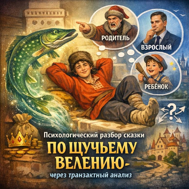 🗳️ Ну и сказка, за которую проголосовали больше всего! 🧠 Психологический разбор сказки «По щучьему велению» через призму транзактного анализа Сегодня посмотрим на Емелю не как на «ленивого везунчика», а как на носителя определённых эго-состояний — Родитель, Взрослый и Ребёнок. 🛌 Емеля: доминирование Свободного Ребёнка Емеля живёт в режиме Свободного Ребёнка: • избегает ответственности • стремится к удовольствию и покою • действует по принципу: «Хочу — значит должно случиться» Он не строит планы, не анализирует последствия и не берёт на себя взрослую роль. Его мотивация — минимум усилий, максимум комфорта. 🐟 Щука как внешний «Взрослый» Щука выполняет функцию внешнего Взрослого: • принимает решения за Емелю • берёт на себя анализ реальности • решает задачи, которые герой сам решать не хочет Формируется сценарий: «Мне не нужно взрослеть — кто-то сильный всё сделает за меня». Это пример зависимой жизненной позиции. 🧱 Конфликт с Родителем (общественными нормами) Общество о
