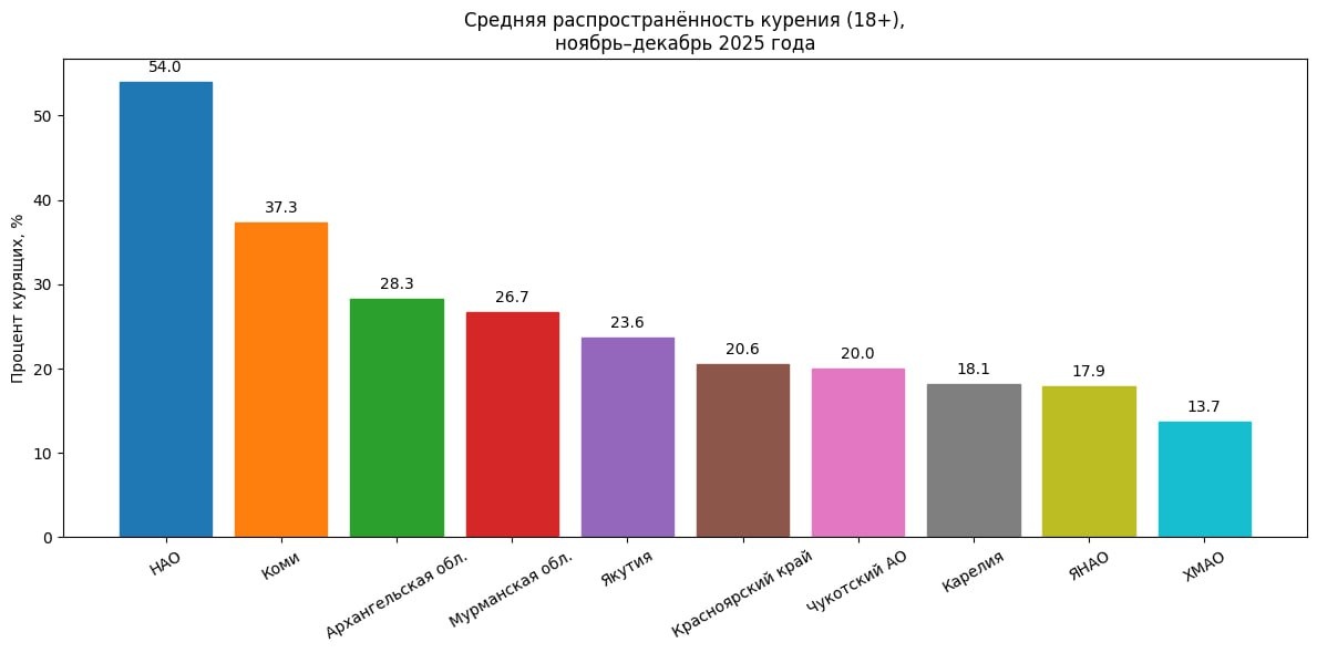 Первая статистика появилась в ноябре. Статистика показывает, какой процент людей старше 18 лет, прошедших медосмотры и диспансеризацию в отчётном году, был признан курящими с учётом региональной корректировки. Так, согласно данным за первые два месяца, самый курящий регион в Арктике – Ненецкий АО – 54,75% и показатель демонстрирует рост. Далее следуют Республика Коми – 36,61% и Архангельская область – 30,02%. Самым же некурящим регионом АЗРФ (в среднем значении) является Ханты-Мансийский АО – здесь курит всего 13,7% прошедшего медосмотры и диспансеризацию населения. ❄ «Арктический Обозреватель»